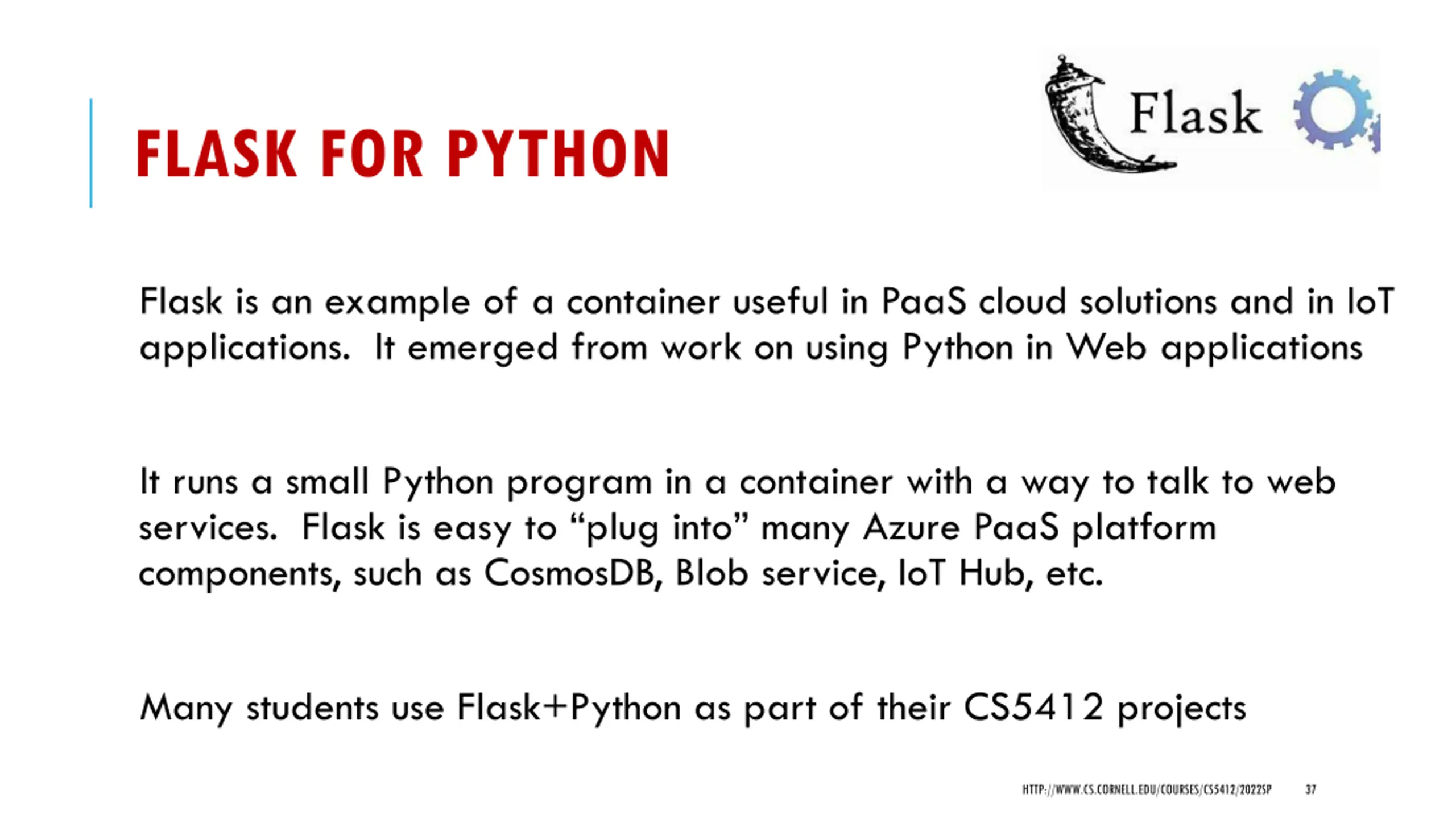 FLASK FOR PYTHON Flask is an example of a container useful in PaaS cloud solutions and in IoT applications. It emerged from work on using Python in Web applications It runs a small Python program in a container with a way to talk to web services. Flask is easy to plug into many Azure PaaS platform components, such as CosmosDB, Blob service, IoT Hub, etc. Many students use Flask+Python as part of their CS5412 projects HTTP://WWW.CS.CORNELL.EDU/COURSES/CS5412/2022SP 37