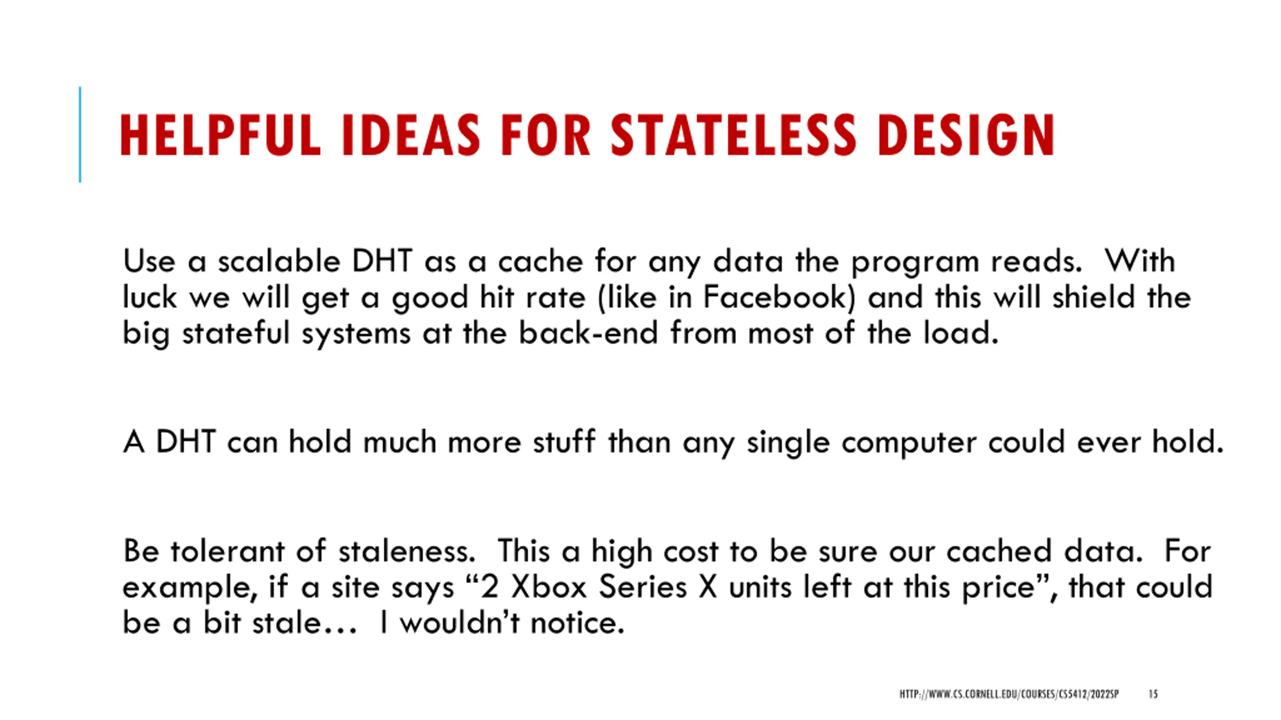 HELPFUL IDEAS FOR STATELESS DESIGN Use a scalable DHT as a cache for any data the program reads. With luck we will get a good hit rate (like in Facebook) and this will shield the big stateful systems at the back-end from most of the load. A DHT can hold much more stuff than any single computer could ever hold. Be tolerant of staleness. This a high cost to be sure our cached data. For example, if a site says 2 Xbox Series X units left at this price , that could be a bit stale I wouldn t notice. HTTP://WWW.CS.CORNELL.EDU/COURSES/CS5412/2022SP 15