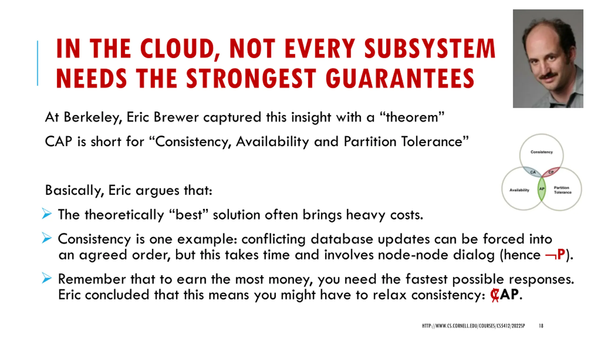 IN THE CLOUD, NOT EVERY SUBSYSTEM NEEDS THE STRONGEST GUARANTEES At Berkeley, Eric Brewer captured this insight with a theorem CAP is short for Consistency, Availability and Partition Tolerance Basically, Eric argues that: The theoretically best solution often brings heavy costs. Consistency is one example: conflicting database updates can be forced into an agreed order, but this takes time and involves node-node dialog (hence P). Remember that to earn the most money, you need the fastest possible responses. Eric concluded that this means you might have to relax consistency: CAP. \ HTTP://WWW.CS.CORNELL.EDU/COURSES/CS5412/2022SP 18