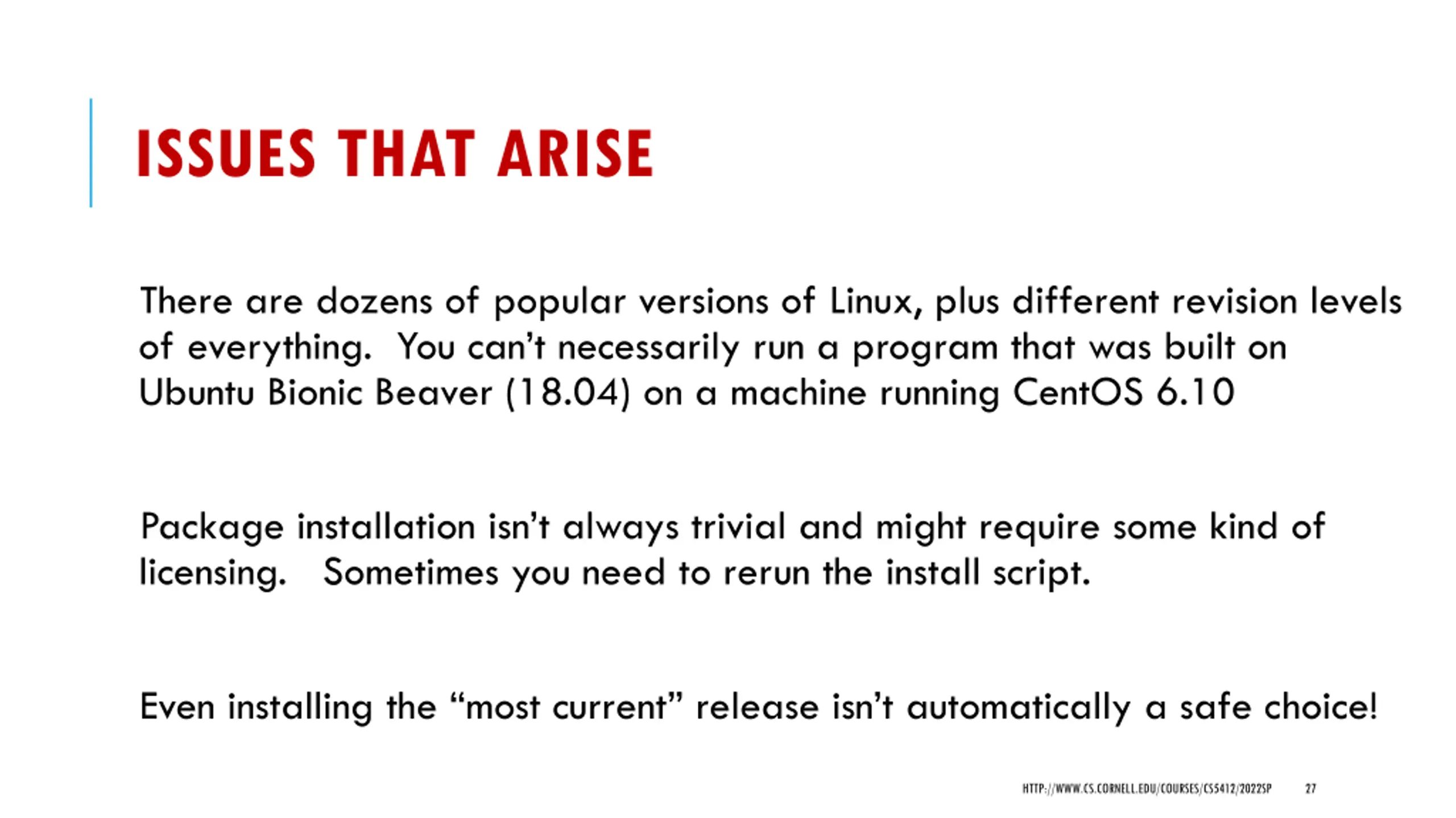 ISSUES THAT ARISE There are dozens of popular versions of Linux, plus different revision levels of everything. You can t necessarily run a program that was built on Ubuntu Bionic Beaver (18.04) on a machine running CentOS 6.10 Package installation isn t always trivial and might require some kind of licensing. Sometimes you need to rerun the install script. Even installing the most current release isn t automatically a safe choice! HTTP://WWW.CS.CORNELL.EDU/COURSES/CS5412/2022SP 27
