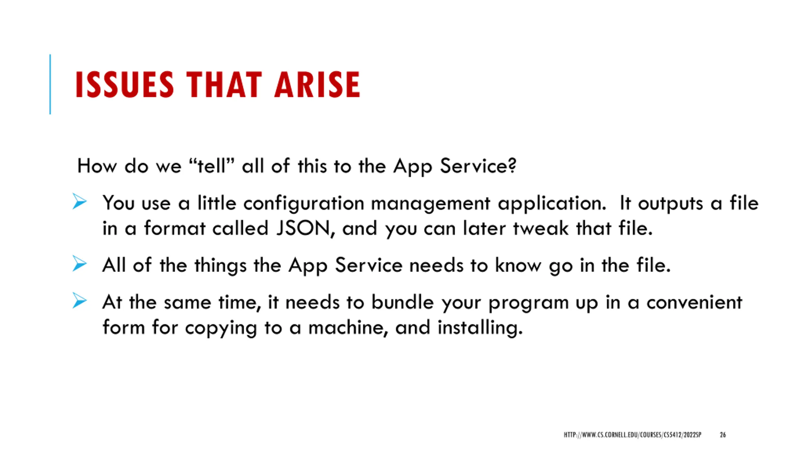 ISSUES THAT ARISE How do we tell all of this to the App Service? You use a little configuration management application. It outputs a file in a format called JSON, and you can later tweak that file. All of the things the App Service needs to know go in the file. At the same time, it needs to bundle your program up in a convenient form for copying to a machine, and installing. HTTP://WWW.CS.CORNELL.EDU/COURSES/CS5412/2022SP 26