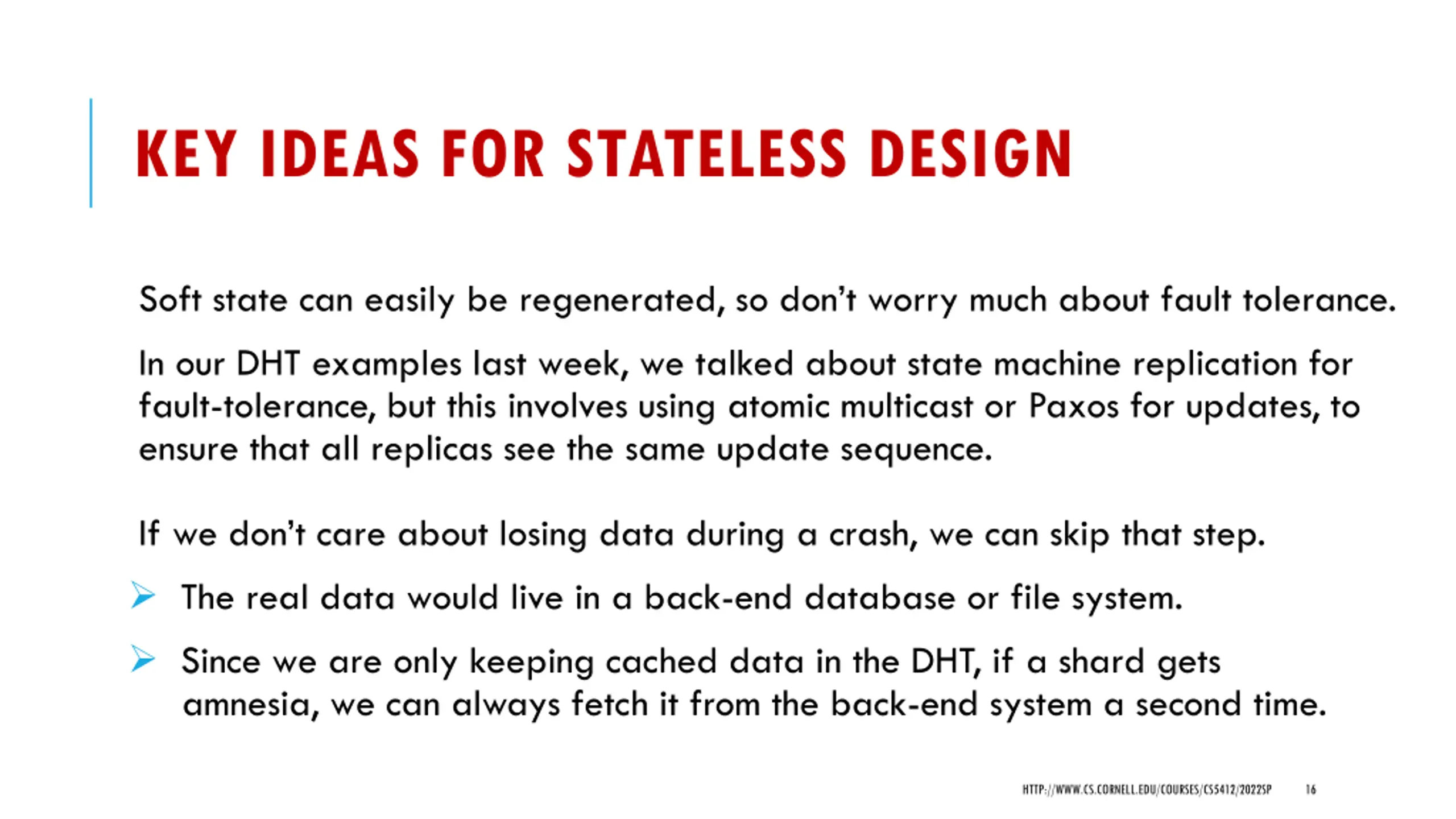 KEY IDEAS FOR STATELESS DESIGN Soft state can easily be regenerated, so don t worry much about fault tolerance. In our DHT examples last week, we talked about state machine replication for fault-tolerance, but this involves using atomic multicast or Paxos for updates, to ensure that all replicas see the same update sequence. If we don t care about losing data during a crash, we can skip that step. The real data would live in a back-end database or file system. Since we are only keeping cached data in the DHT, if a shard gets amnesia, we can always fetch it from the back-end system a second time. HTTP://WWW.CS.CORNELL.EDU/COURSES/CS5412/2022SP 16