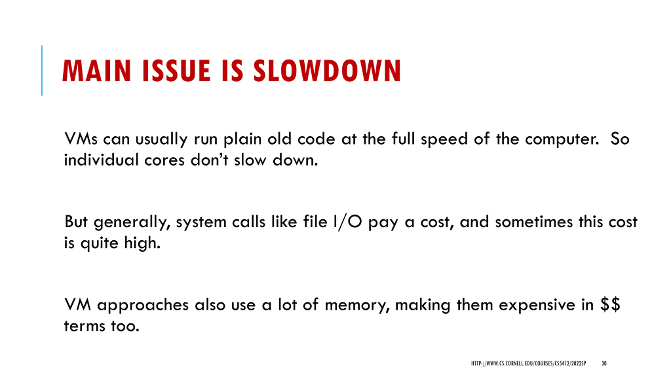MAIN ISSUE IS SLOWDOWN VMs can usually run plain old code at the full speed of the computer. So individual cores don t slow down. But generally, system calls like file I/O pay a cost, and sometimes this cost is quite high. VM approaches also use a lot of memory, making them expensive in $$ terms too. HTTP://WWW.CS.CORNELL.EDU/COURSES/CS5412/2022SP 30