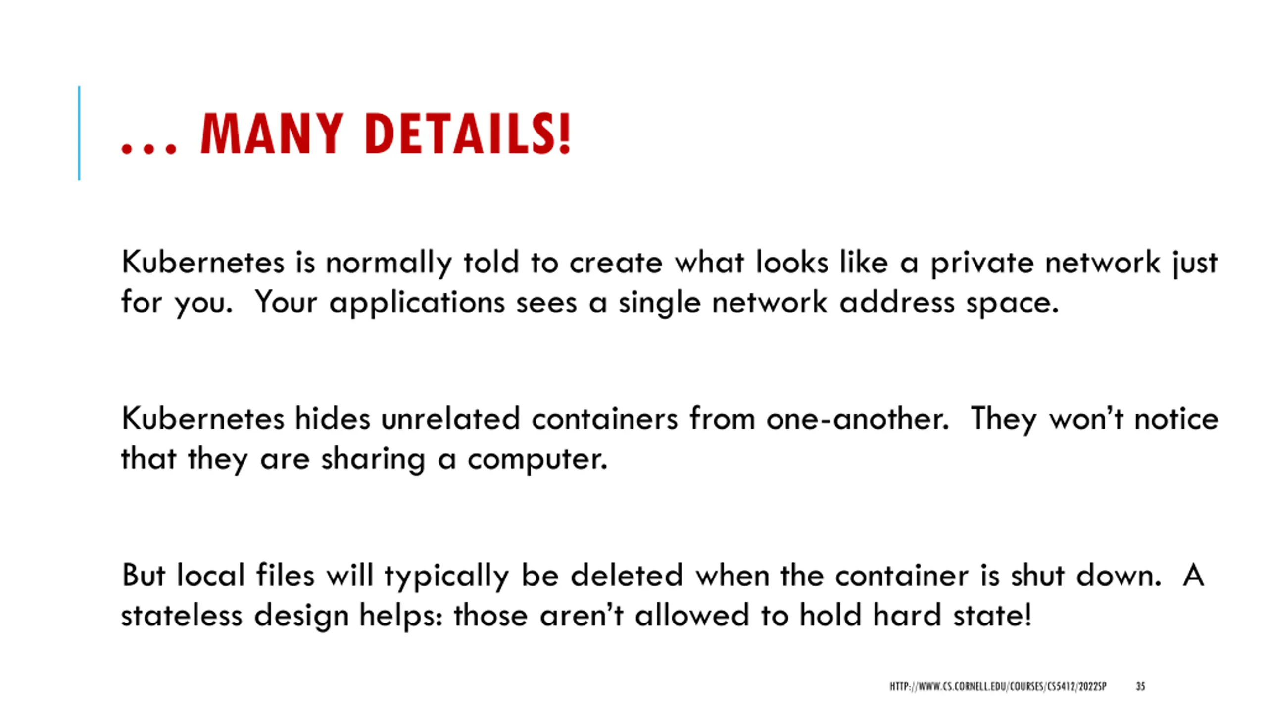 MANY DETAILS! Kubernetes is normally told to create what looks like a private network just for you. Your applications sees a single network address space. Kubernetes hides unrelated containers from one-another. They won t notice that they are sharing a computer. But local files will typically be deleted when the container is shut down. A stateless design helps: those aren t allowed to hold hard state! HTTP://WWW.CS.CORNELL.EDU/COURSES/CS5412/2022SP 35