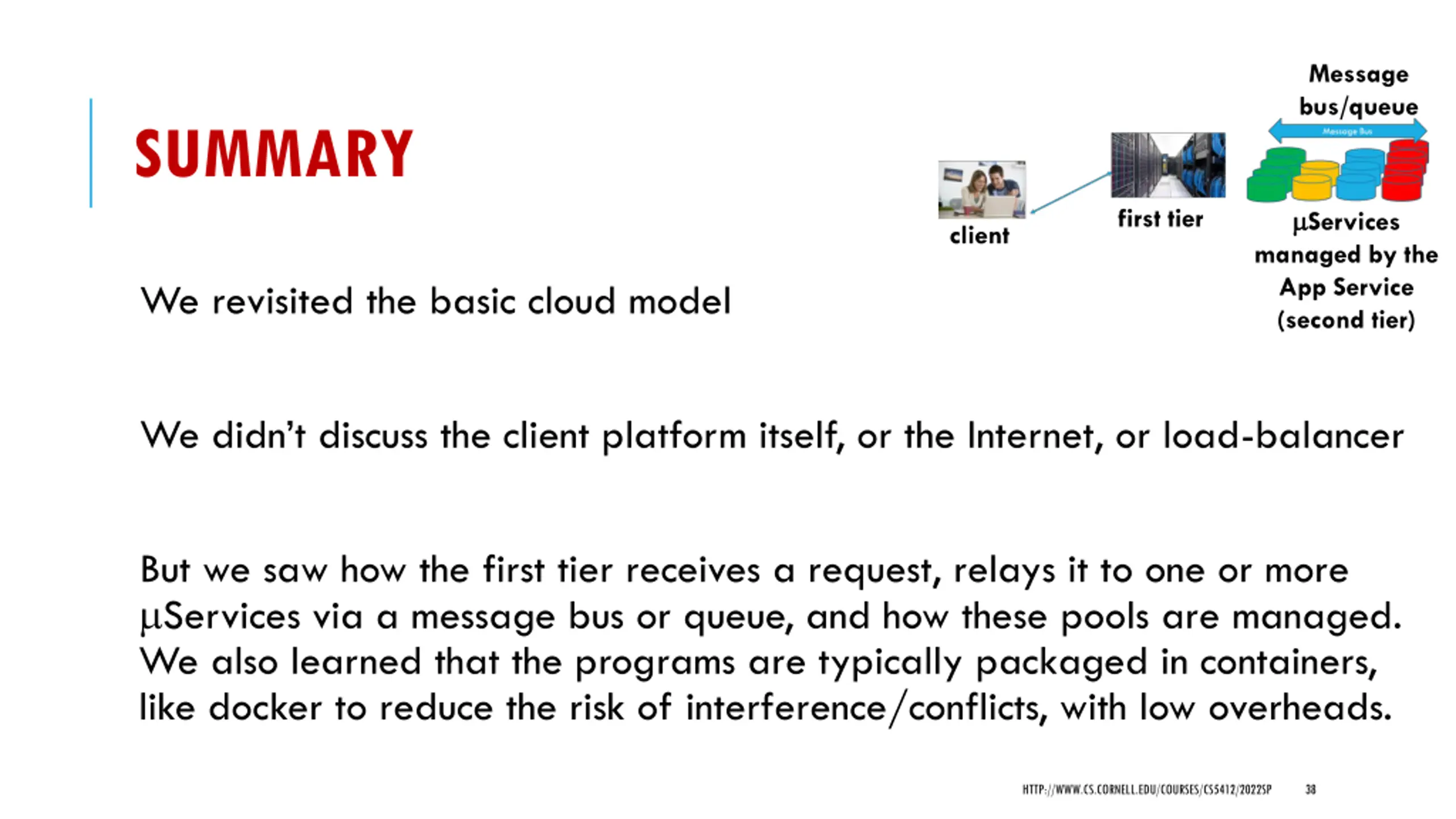 Message bus/queue SUMMARY Services managed by the App Service (second tier) first tier client We revisited the basic cloud model We didn t discuss the client platform itself, or the Internet, or load-balancer But we saw how the first tier receives a request, relays it to one or more Services via a message bus or queue, and how these pools are managed. We also learned that the programs are typically packaged in containers, like docker to reduce the risk of interference/conflicts, with low overheads. HTTP://WWW.CS.CORNELL.EDU/COURSES/CS5412/2022SP 38