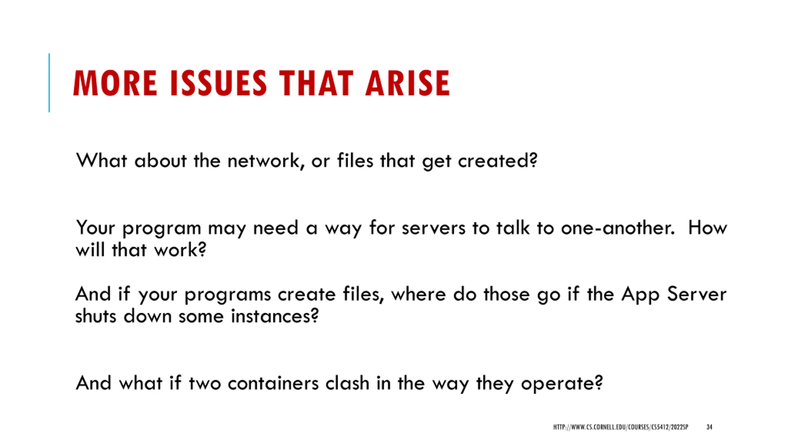 MORE ISSUES THAT ARISE What about the network, or files that get created? Your program may need a way for servers to talk to one-another. How will that work? And if your programs create files, where do those go if the App Server shuts down some instances? And what if two containers clash in the way they operate? HTTP://WWW.CS.CORNELL.EDU/COURSES/CS5412/2022SP 34
