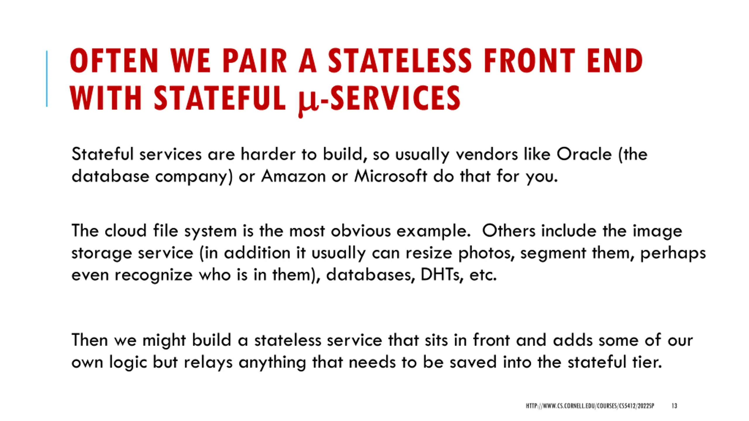 OFTEN WE PAIR A STATELESS FRONT END WITH STATEFUL -SERVICES Stateful services are harder to build, so usually vendors like Oracle (the database company) or Amazon or Microsoft do that for you. The cloud file system is the most obvious example. Others include the image storage service (in addition it usually can resize photos, segment them, perhaps even recognize who is in them), databases, DHTs, etc. Then we might build a stateless service that sits in front and adds some of our own logic but relays anything that needs to be saved into the stateful tier. HTTP://WWW.CS.CORNELL.EDU/COURSES/CS5412/2022SP 13