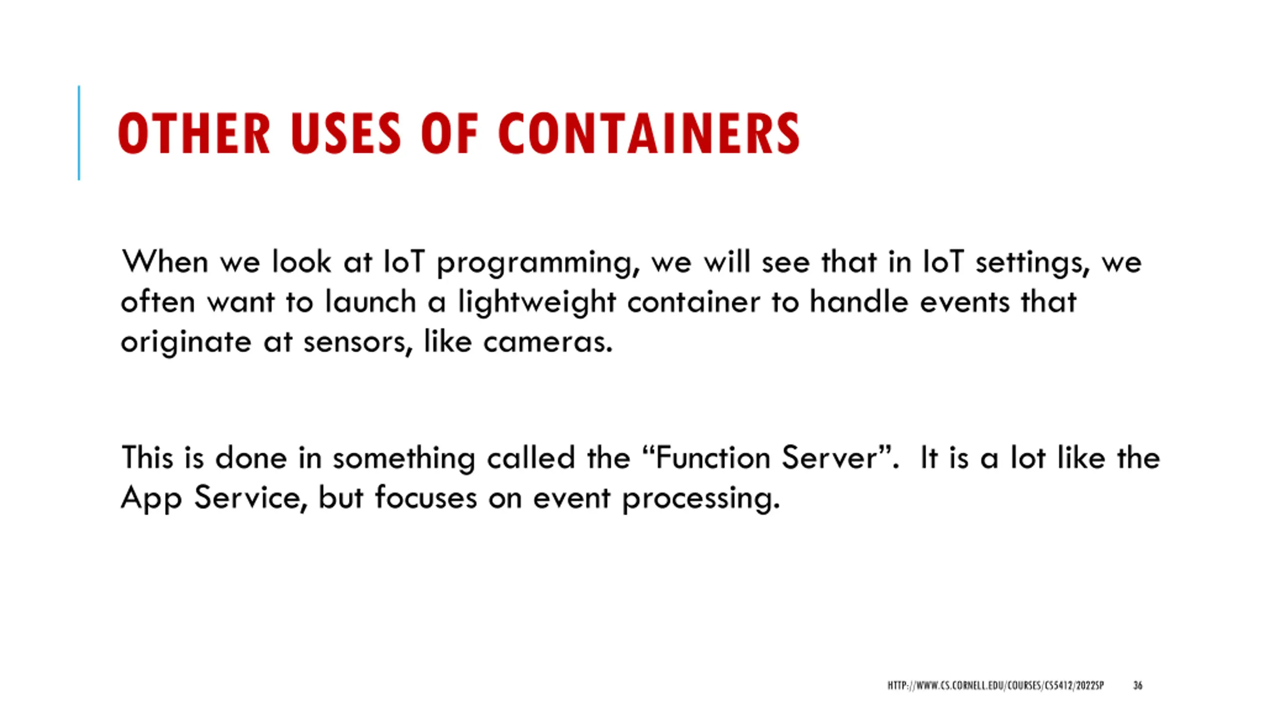OTHER USES OF CONTAINERS When we look at IoT programming, we will see that in IoT settings, we often want to launch a lightweight container to handle events that originate at sensors, like cameras. This is done in something called the Function Server . It is a lot like the App Service, but focuses on event processing. HTTP://WWW.CS.CORNELL.EDU/COURSES/CS5412/2022SP 36