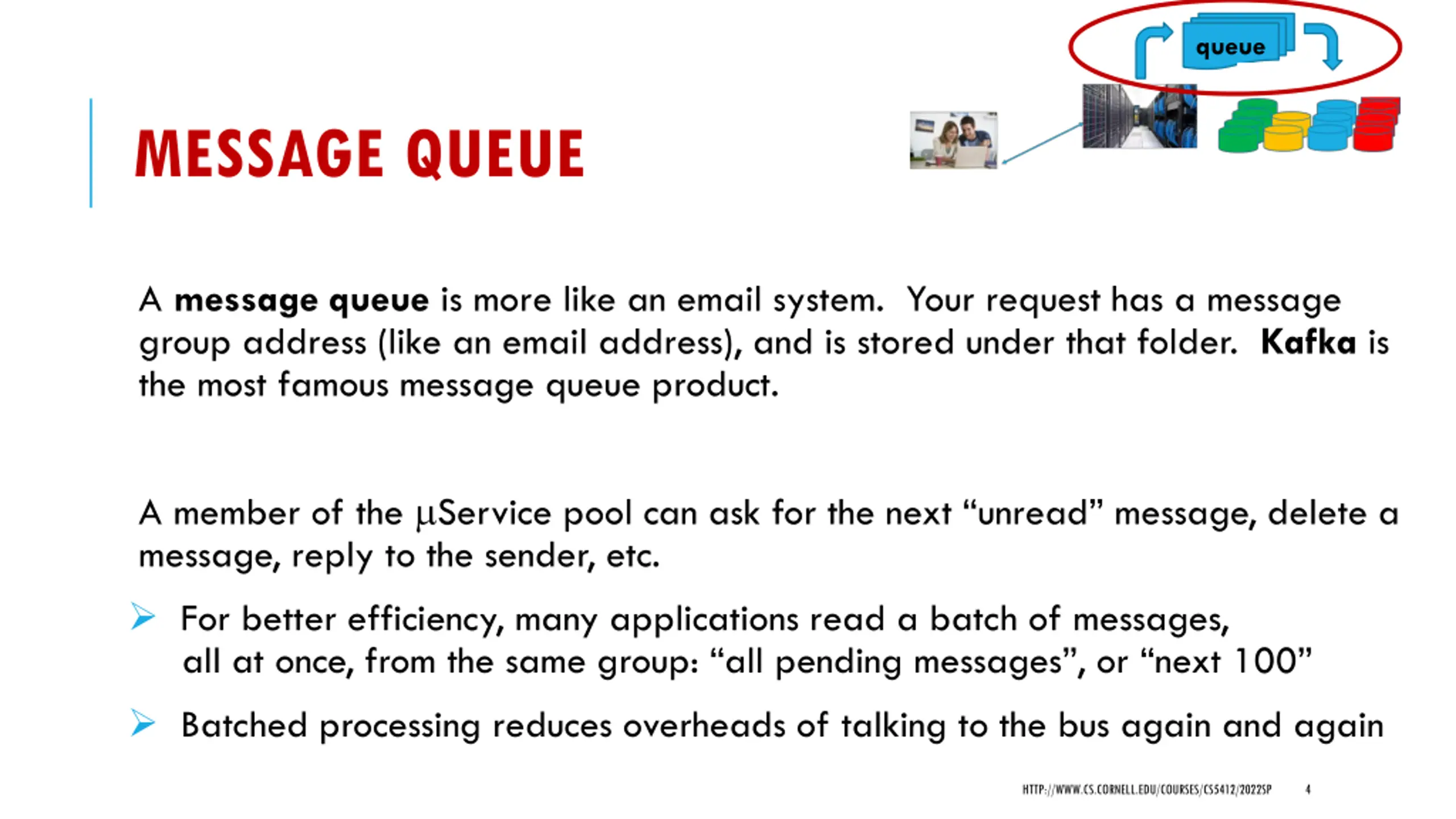 queue MESSAGE QUEUE A message queue is more like an email system. Your request has a message group address (like an email address), and is stored under that folder. Kafka is the most famous message queue product. A member of the Service pool can ask for the next unread message, delete a message, reply to the sender, etc. For better efficiency, many applications read a batch of messages, all at once, from the same group: all pending messages , or next 100 Batched processing reduces overheads of talking to the bus again and again HTTP://WWW.CS.CORNELL.EDU/COURSES/CS5412/2022SP 4