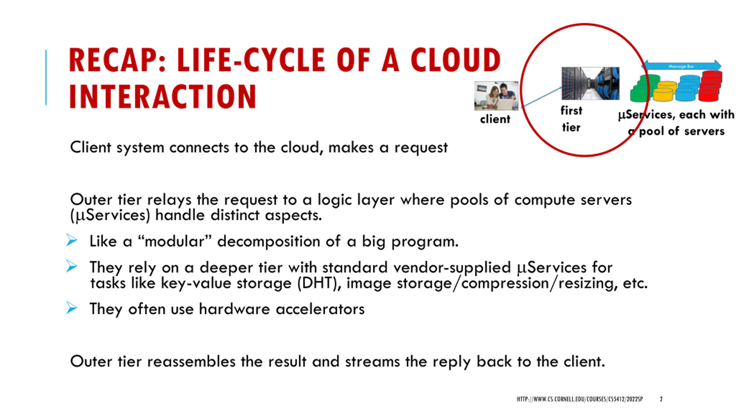 RECAP: LIFE-CYCLE OF A CLOUD INTERACTION first tier Services, each with a pool of servers client Client system connects to the cloud, makes a request Outer tier relays the request to a logic layer where pools of compute servers ( Services) handle distinct aspects. Like a modular decomposition of a big program. They rely on a deeper tier with standard vendor-supplied Services for tasks like key-value storage (DHT), image storage/compression/resizing, etc. They often use hardware accelerators Outer tier reassembles the result and streams the reply back to the client. HTTP://WWW.CS.CORNELL.EDU/COURSES/CS5412/2022SP 2