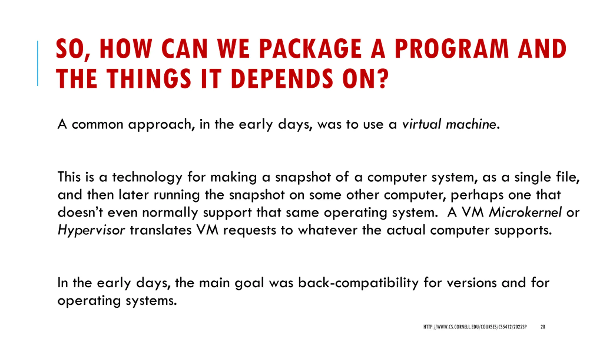 SO, HOW CAN WE PACKAGE A PROGRAM AND THE THINGS IT DEPENDS ON? A common approach, in the early days, was to use a virtual machine. This is a technology for making a snapshot of a computer system, as a single file, and then later running the snapshot on some other computer, perhaps one that doesn t even normally support that same operating system. A VM Microkernel or Hypervisor translates VM requests to whatever the actual computer supports. In the early days, the main goal was back-compatibility for versions and for operating systems. HTTP://WWW.CS.CORNELL.EDU/COURSES/CS5412/2022SP 28