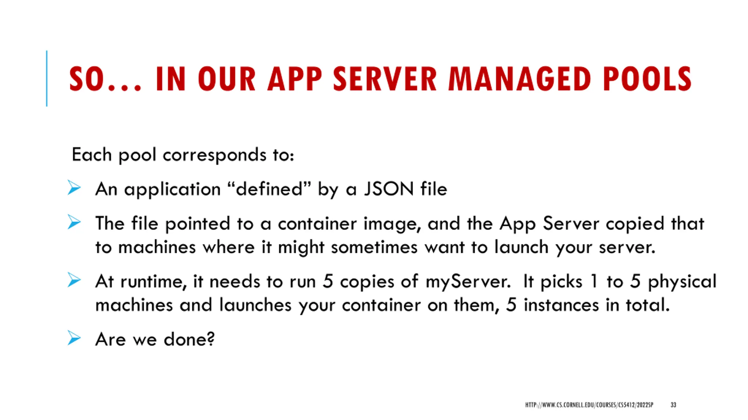 SO IN OUR APP SERVER MANAGED POOLS Each pool corresponds to: An application defined by a JSON file The file pointed to a container image, and the App Server copied that to machines where it might sometimes want to launch your server. At runtime, it needs to run 5 copies of myServer. It picks 1 to 5 physical machines and launches your container on them, 5 instances in total. Are we done? HTTP://WWW.CS.CORNELL.EDU/COURSES/CS5412/2022SP 33