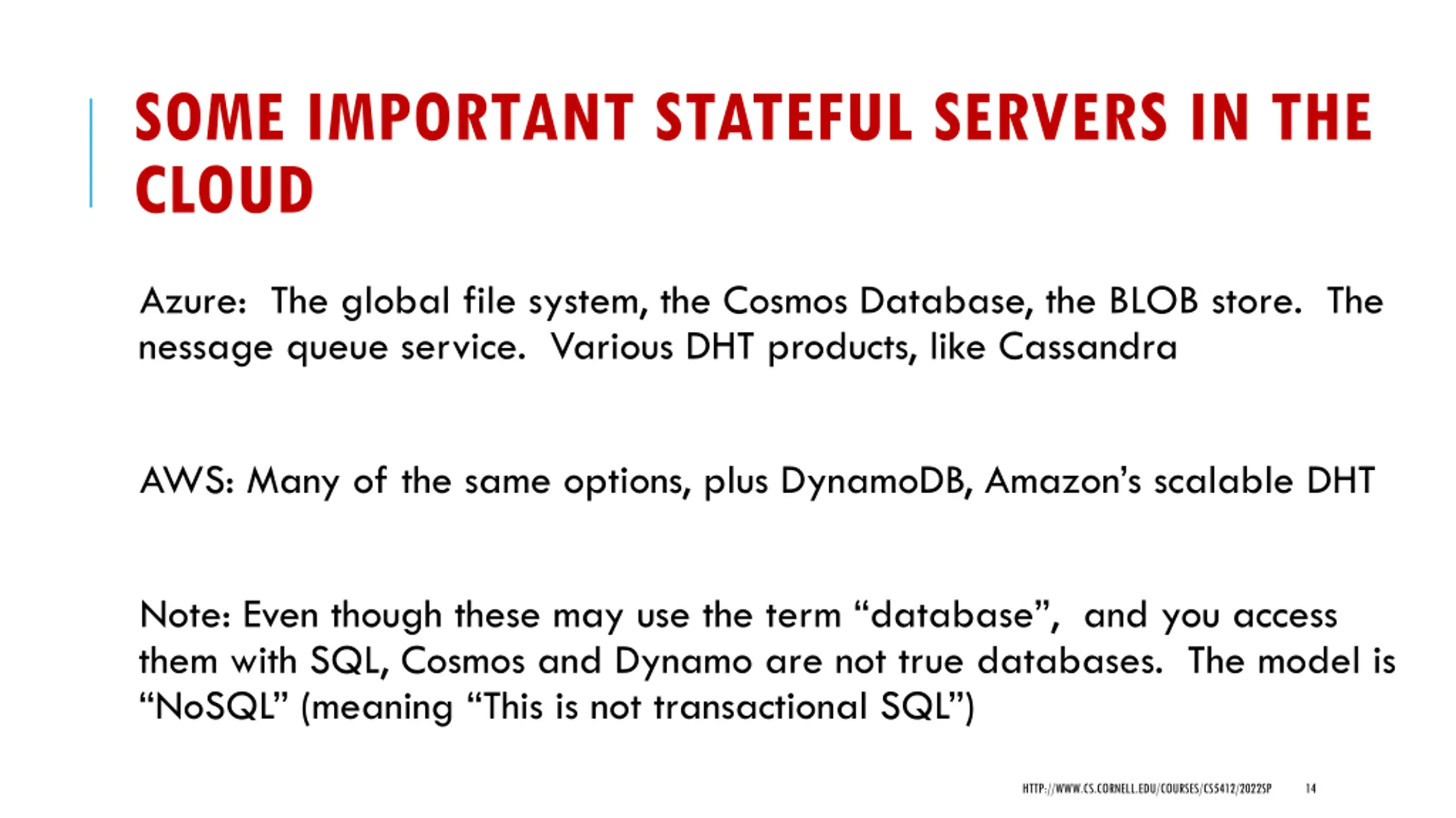 SOME IMPORTANT STATEFUL SERVERS IN THE CLOUD Azure: The global file system, the Cosmos Database, the BLOB store. The nessage queue service. Various DHT products, like Cassandra AWS: Many of the same options, plus DynamoDB, Amazon s scalable DHT Note: Even though these may use the term database , and you access them with SQL, Cosmos and Dynamo are not true databases. The model is NoSQL (meaning This is not transactional SQL ) HTTP://WWW.CS.CORNELL.EDU/COURSES/CS5412/2022SP 14