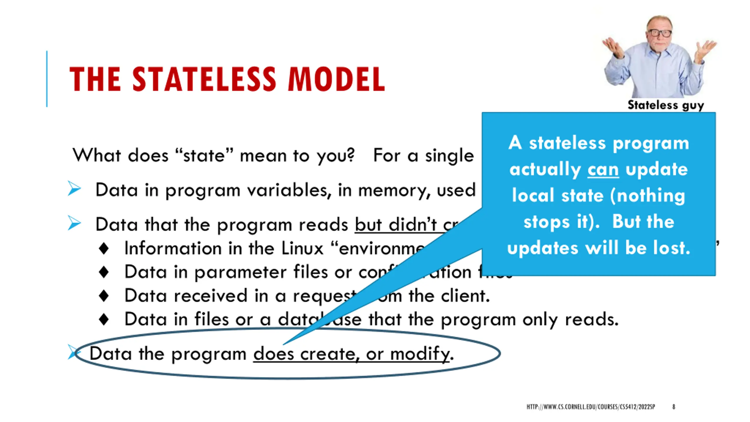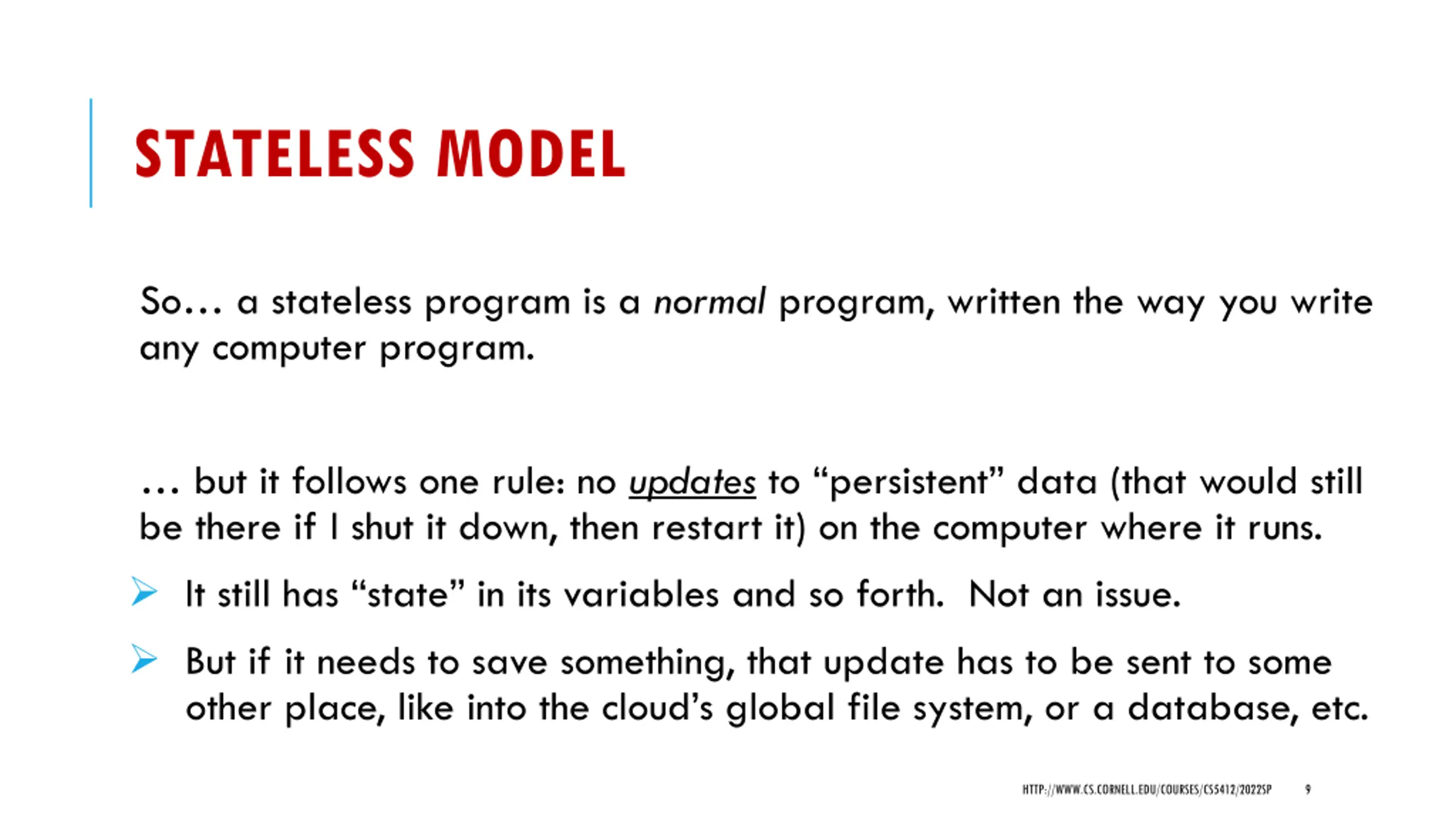 STATELESS MODEL So a stateless program is a normal program, written the way you write any computer program. but it follows one rule: no updatesto persistent data (that would still be there if I shut it down, then restart it) on the computer where it runs. It still has state in its variables and so forth. Not an issue. But if it needs to save something, that update has to be sent to some other place, like into the cloud s global file system, or a database, etc. HTTP://WWW.CS.CORNELL.EDU/COURSES/CS5412/2022SP 9