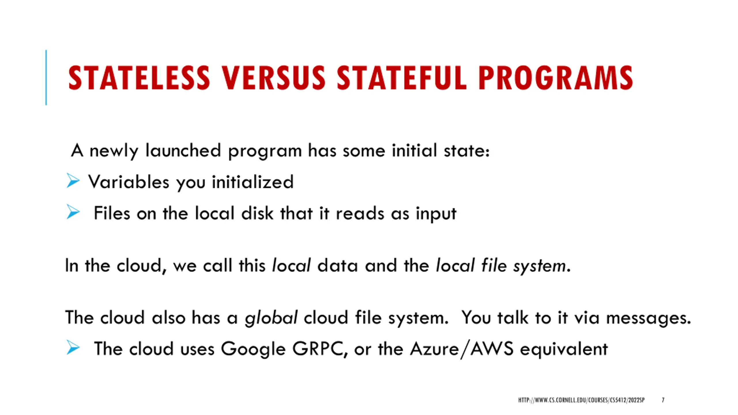 STATELESS VERSUS STATEFUL PROGRAMS A newly launched program has some initial state: Variables you initialized Files on the local disk that it reads as input In the cloud, we call this local data and the local file system. The cloud also has a global cloud file system. You talk to it via messages. The cloud uses Google GRPC, or the Azure/AWS equivalent HTTP://WWW.CS.CORNELL.EDU/COURSES/CS5412/2022SP 7
