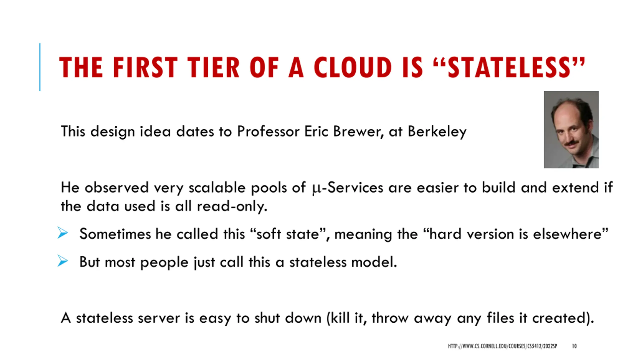 THE FIRST TIER OF A CLOUD IS STATELESS This design idea dates to Professor Eric Brewer, at Berkeley He observed very scalable pools of -Services are easier to build and extend if the data used is all read-only. Sometimes he called this soft state , meaning the hard version is elsewhere But most people just call this a stateless model. A stateless server is easy to shut down (kill it, throw away any files it created). HTTP://WWW.CS.CORNELL.EDU/COURSES/CS5412/2022SP 10