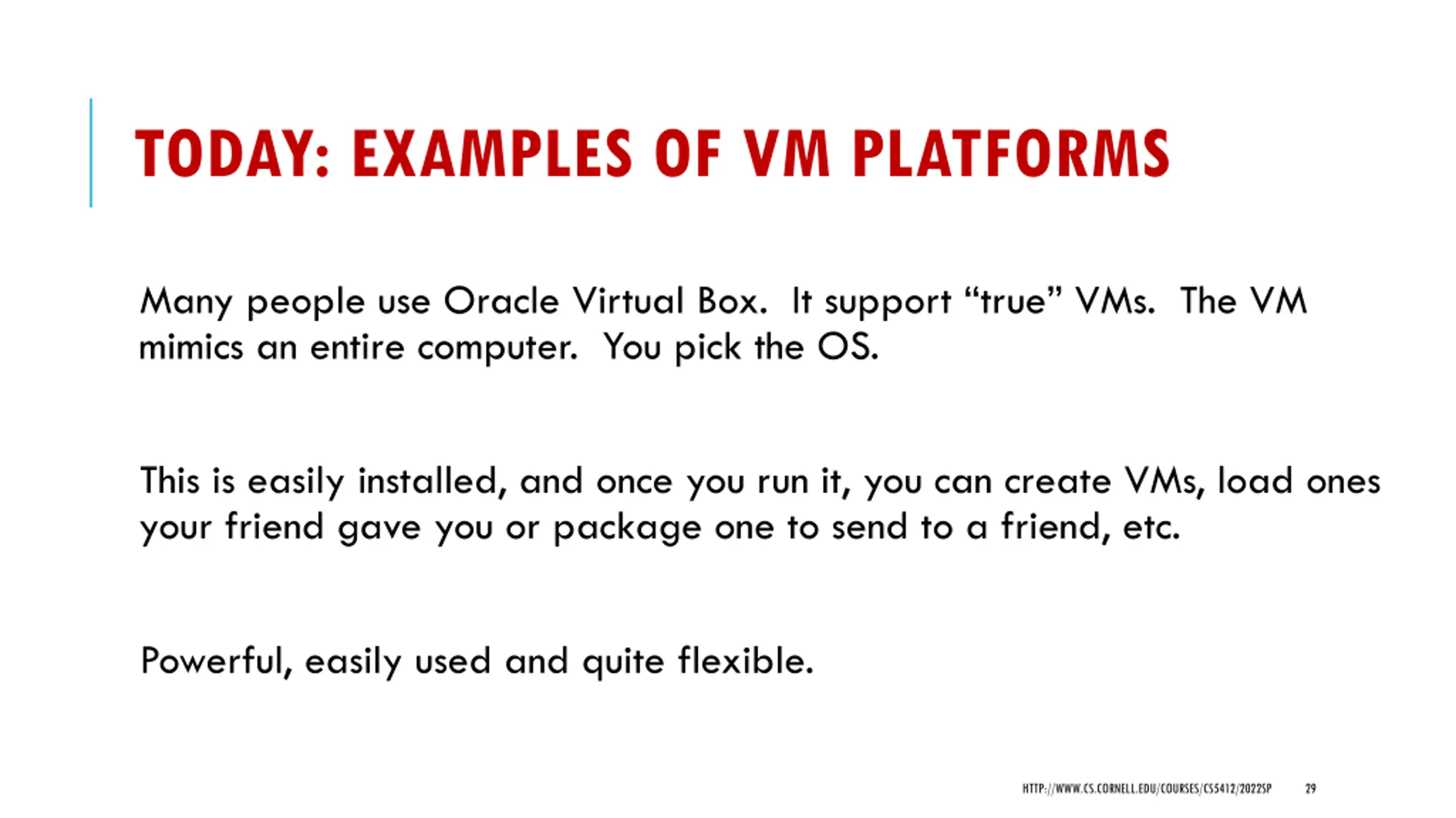 TODAY: EXAMPLES OF VM PLATFORMS Many people use Oracle Virtual Box. It support true VMs. The VM mimics an entire computer. You pick the OS. This is easily installed, and once you run it, you can create VMs, load ones your friend gave you or package one to send to a friend, etc. Powerful, easily used and quite flexible. HTTP://WWW.CS.CORNELL.EDU/COURSES/CS5412/2022SP 29