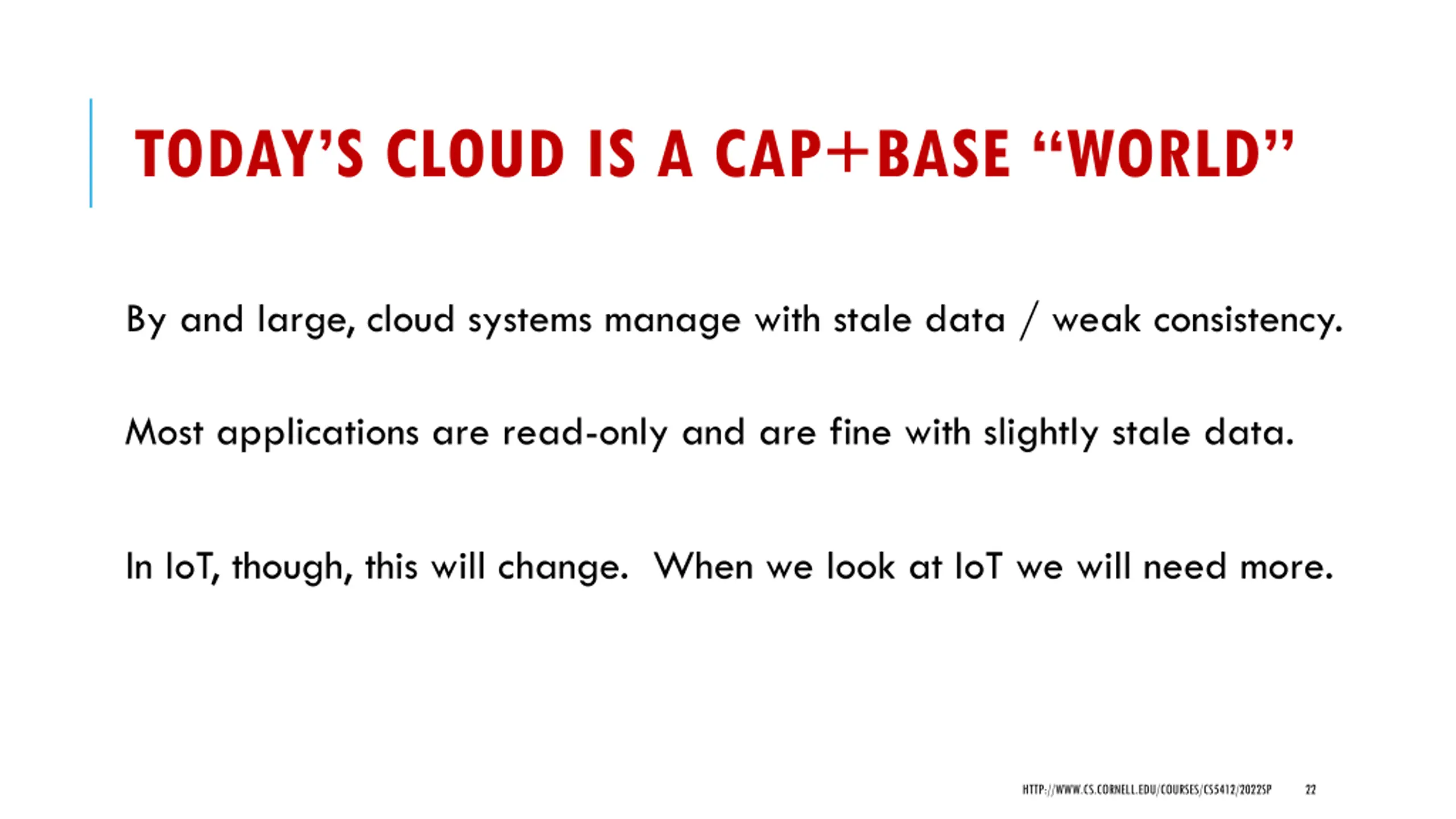 TODAYS CLOUD IS A CAP+BASE WORLD By and large, cloud systems manage with stale data / weak consistency. Most applications are read-only and are fine with slightly stale data. In IoT, though, this will change. When we look at IoT we will need more. HTTP://WWW.CS.CORNELL.EDU/COURSES/CS5412/2022SP 22