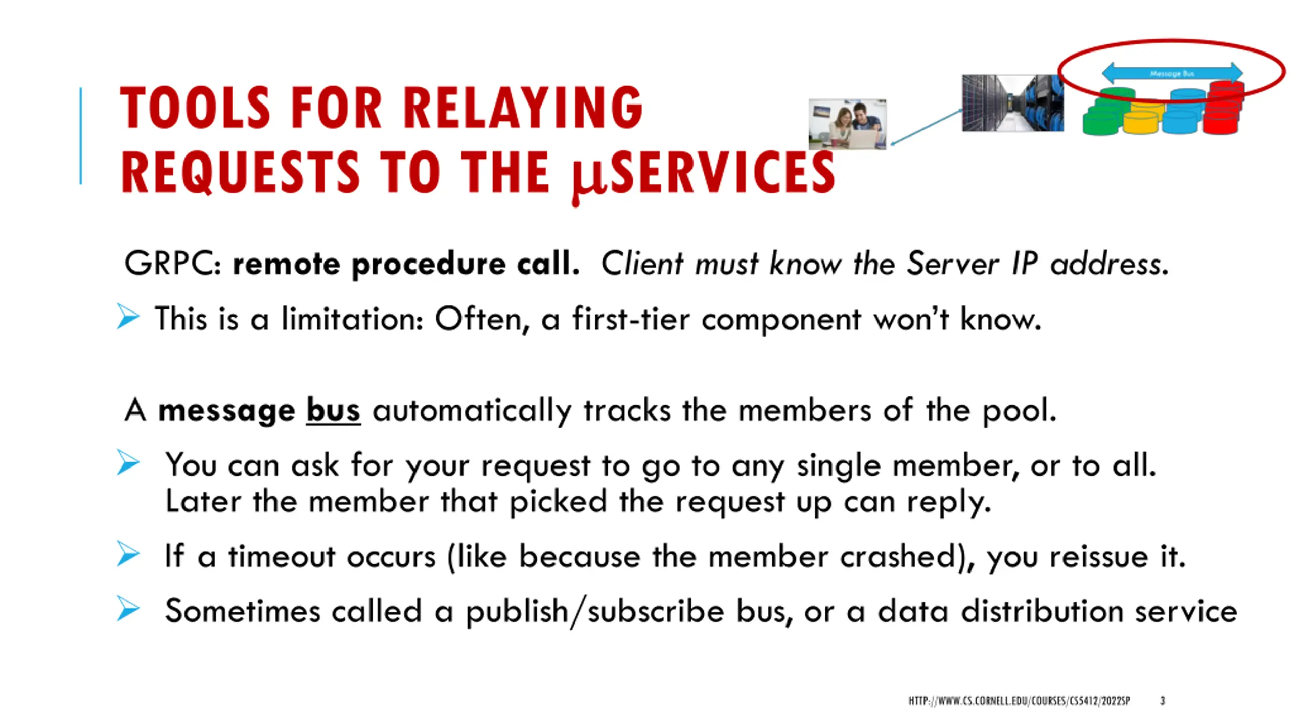 TOOLS FOR RELAYING REQUESTS TO THE SERVICES GRPC: remote procedure call. Client must know the Server IP address. This is a limitation: Often, a first-tier component won t know. A message bus automatically tracks the members of the pool. You can ask for your request to go to any single member, or to all. Later the member that picked the request up can reply. If a timeout occurs (like because the member crashed), you reissue it. Sometimes called a publish/subscribe bus, or a data distribution service HTTP://WWW.CS.CORNELL.EDU/COURSES/CS5412/2022SP 3
