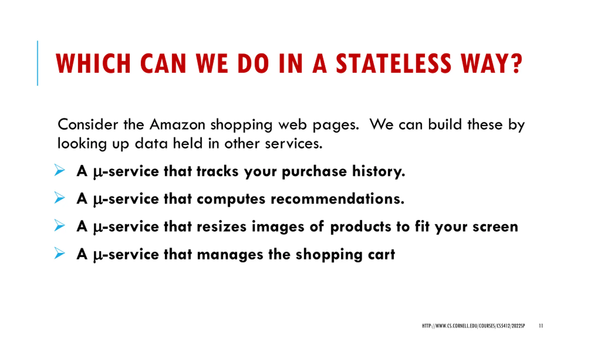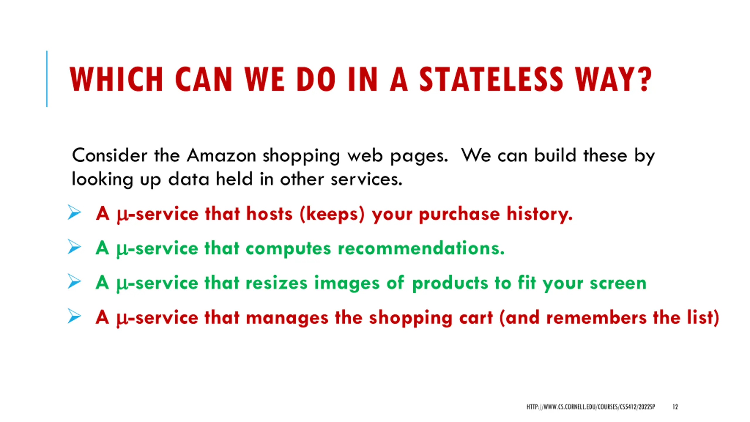WHICH CAN WE DO IN A STATELESS WAY? Consider the Amazon shopping web pages. We can build these by looking up data held in other services. A -service that tracks your purchase history. A -service that computes recommendations. A -service that resizes images of products to fit your screen A -service that manages the shopping cart HTTP://WWW.CS.CORNELL.EDU/COURSES/CS5412/2022SP 11