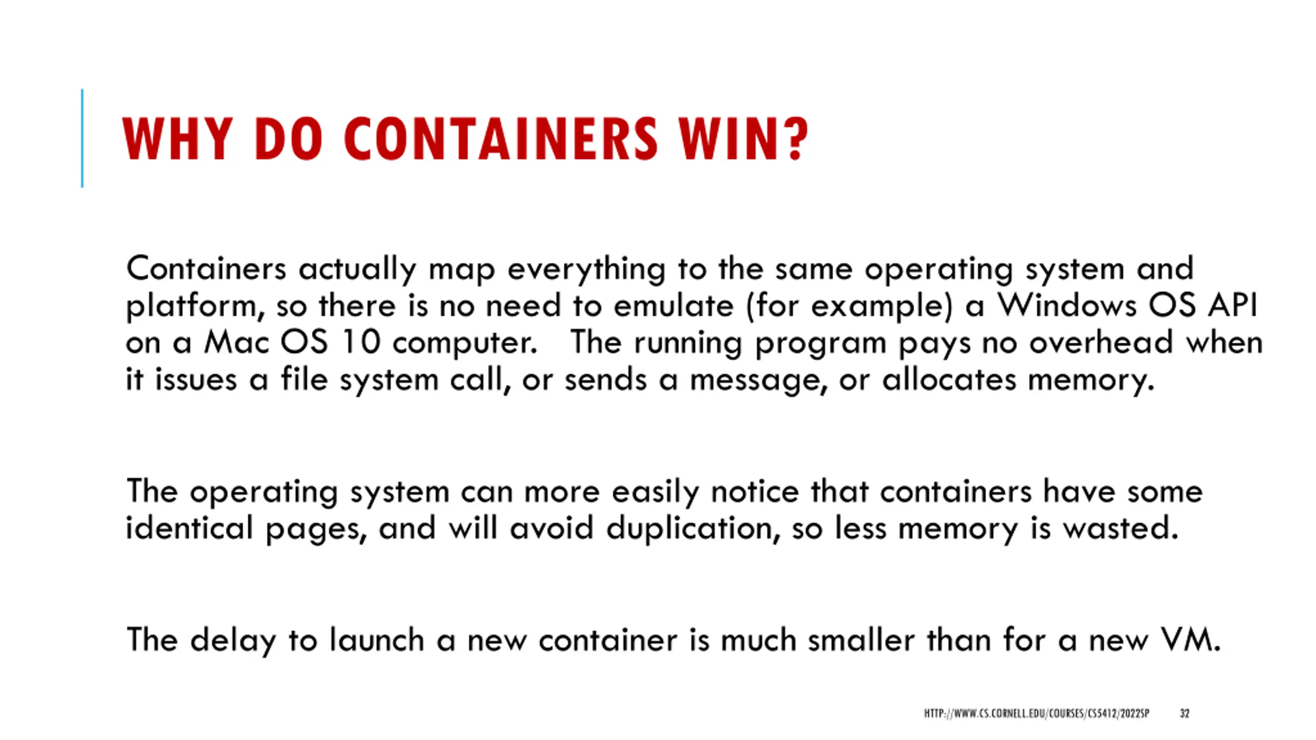 WHY DO CONTAINERS WIN? Containers actually map everything to the same operating system and platform, so there is no need to emulate (for example) a Windows OS API on a Mac OS 10 computer. The running program pays no overhead when it issues a file system call, or sends a message, or allocates memory. The operating system can more easily notice that containers have some identical pages, and will avoid duplication, so less memory is wasted. The delay to launch a new container is much smaller than for a new VM. HTTP://WWW.CS.CORNELL.EDU/COURSES/CS5412/2022SP 32