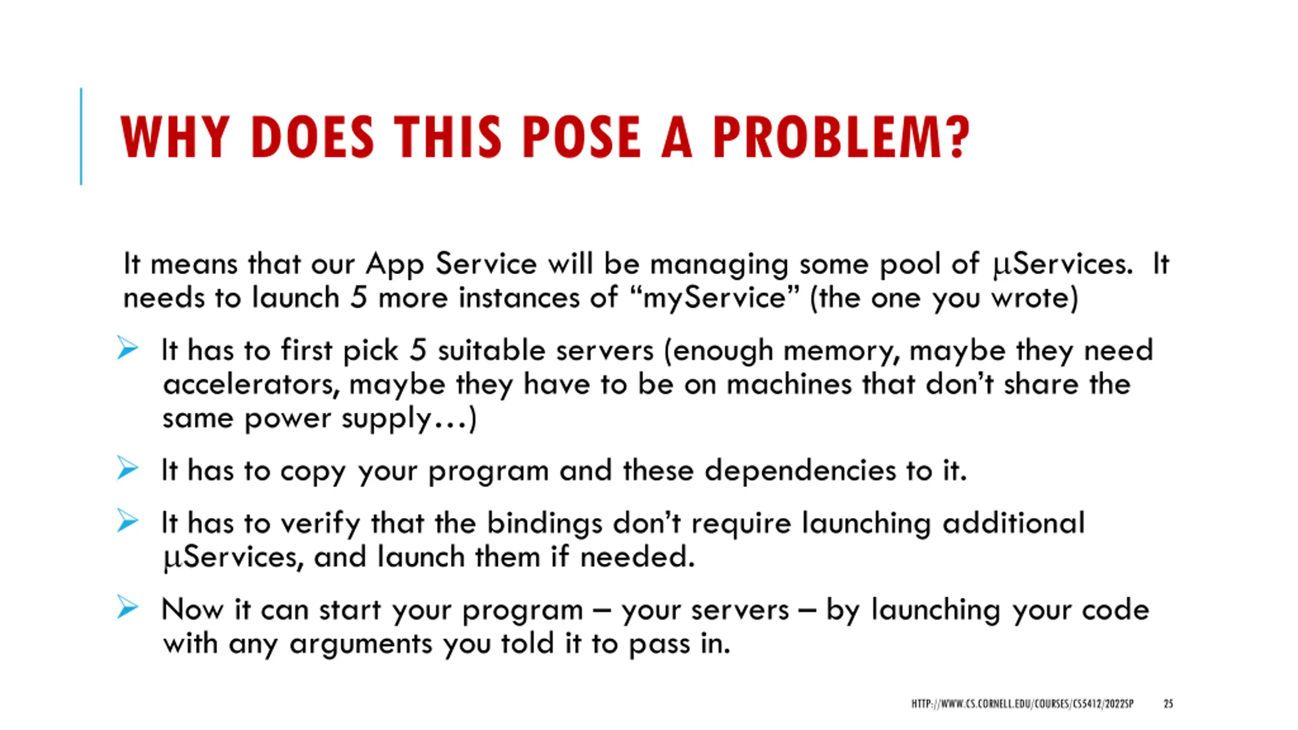 WHY DOES THIS POSE A PROBLEM? It means that our App Service will be managing some pool of Services. It needs to launch 5 more instances of myService (the one you wrote) It has to first pick 5 suitable servers (enough memory, maybe they need accelerators, maybe they have to be on machines that don t share the same power supply ) It has to copy your program and these dependencies to it. It has to verify that the bindings don t require launching additional Services, and launch them if needed. Now it can start your program your servers by launching your code with any arguments you told it to pass in. HTTP://WWW.CS.CORNELL.EDU/COURSES/CS5412/2022SP 25