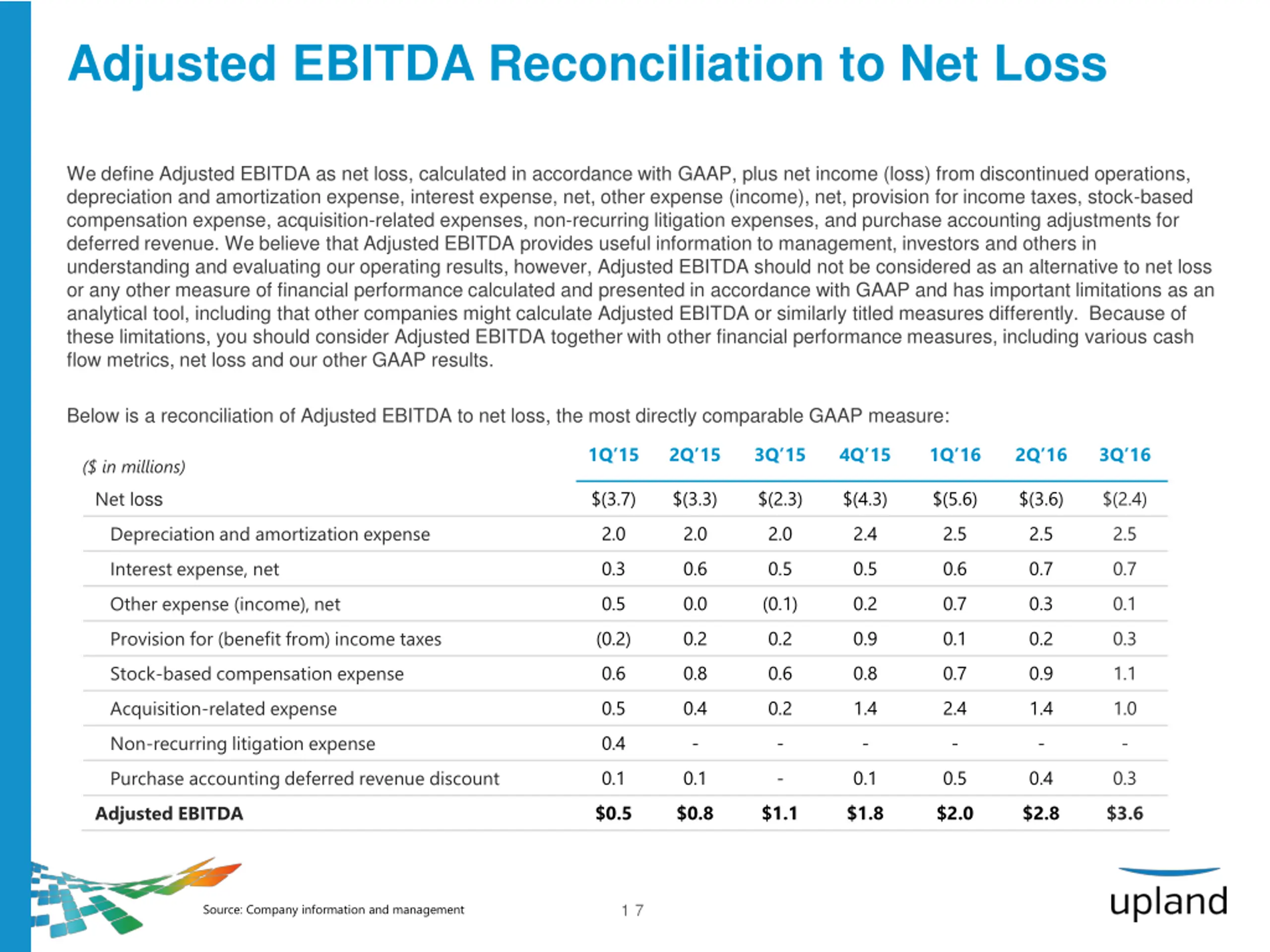 Adjusted EBITDA Reconciliation to Net Loss We define Adjusted EBITDA as net loss, calculated in accordance with GAAP, plus net income (loss) from discontinued operations, depreciation and amortization expense, interest expense, net, other expense (income), net, provision for income taxes, stock-based compensation expense, acquisition-related expenses, non-recurring litigation expenses, and purchase accounting adjustments for deferred revenue. We believe that Adjusted EBITDA provides useful information to management, investors and others in understanding and evaluating our operating results, however, Adjusted EBITDA should not be considered as an alternative to net loss or any other measure of financial performance calculated and presented in accordance with GAAP and has important limitations as an analytical tool, including that other companies might calculate Adjusted EBITDA or similarly titled measures differently. Because of these limitations, you should consider Adjusted EBITDA together with other financial performance measures, including various cash flow metrics, net loss and our other GAAP results. Below is a reconciliation of Adjusted EBITDA to net loss, the most directly comparable GAAP measure: 1Q 15 2Q 15 3Q 15 4Q 15 1Q 16 2Q 16 3Q 16 ($ in millions) $(3.7) $(3.3) $(2.3) $(4.3) $(5.6) $(3.6) $(2.4) Net loss 2.0 2.0 2.0 2.4 2.5 2.5 2.5 Depreciation and amortization expense 0.3 0.6 0.5 0.5 0.6 0.7 0.7 Interest expense, net 0.5 0.0 (0.1) 0.2 0.7 0.3 0.1 Other expense (income), net (0.2) 0.2 0.2 0.9 0.1 0.2 0.3 Provision for (benefit from) income taxes 0.6 0.8 0.6 0.8 0.7 0.9 1.1 Stock-based compensation expense 0.5 0.4 0.2 1.4 2.4 1.4 1.0 Acquisition-related expense 0.4 - - - - - - Non-recurring litigation expense 0.1 0.1 - 0.1 0.5 0.4 0.3 Purchase accounting deferred revenue discount $0.5 $0.8 $1.1 $1.8 $2.0 $2.8 $3.6 Adjusted EBITDA Source: Company information and management 1 7