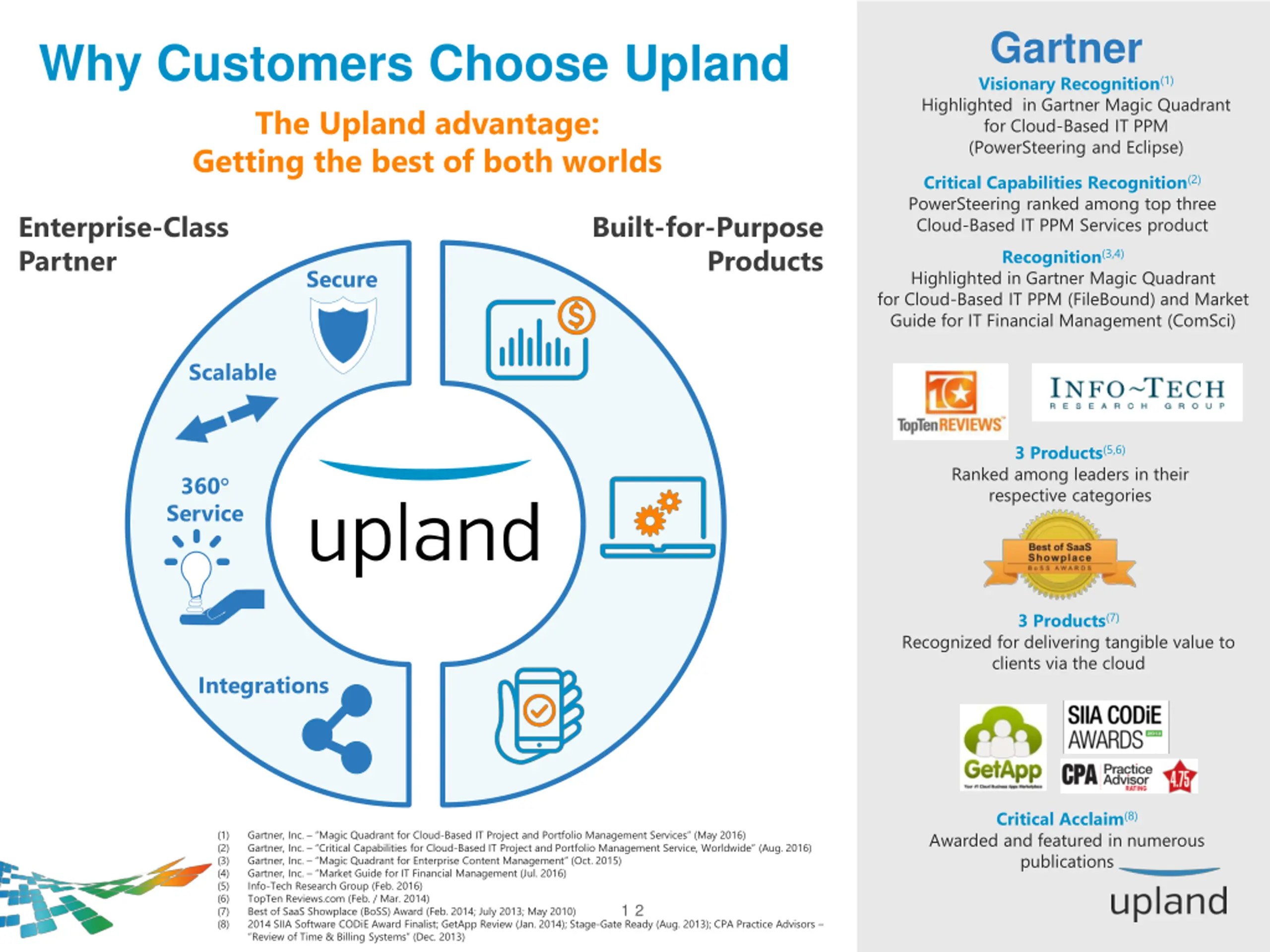 Gartner Why Customers Choose Upland The Upland advantage: Getting the best of both worlds Visionary Recognition(1) Highlighted in Gartner Magic Quadrant for Cloud-Based IT PPM (PowerSteering and Eclipse) Critical Capabilities Recognition(2) PowerSteering ranked among top three Cloud-Based IT PPM Services product Recognition(3,4) Highlighted in Gartner Magic Quadrant for Cloud-Based IT PPM (FileBound) and Market Guide for IT Financial Management (ComSci) Enterprise-Class Partner Built-for-Purpose Products Secure Scalable http://www.ifunia.com/blog/wp-content/uploads/2012/07/toptenreviews1.jpg 3 Products(5,6) Ranked among leaders in their respective categories 360 Service 3 Products(7) Recognized for delivering tangible value to clients via the cloud Integrations Critical Acclaim(8) Awarded and featured in numerous publications (1) (2) (3) (4) (5) (6) (7) (8) Gartner, Inc. Magic Quadrant for Cloud-Based IT Project and Portfolio Management Services (May 2016) Gartner, Inc. Critical Capabilities for Cloud-Based IT Project and Portfolio Management Service, Worldwide (Aug. 2016) Gartner, Inc. Magic Quadrant for Enterprise Content Management (Oct. 2015) Gartner, Inc. Market Guide for IT Financial Management (Jul. 2016) Info-Tech Research Group (Feb. 2016) TopTen Reviews.com (Feb. / Mar. 2014) Best of SaaS Showplace (BoSS) Award (Feb. 2014; July 2013; May 2010) 2014 SIIA Software CODiE Award Finalist; GetApp Review (Jan. 2014); Stage-Gate Ready (Aug. 2013); CPA Practice Advisors Review of Time & Billing Systems (Dec. 2013) 1 2