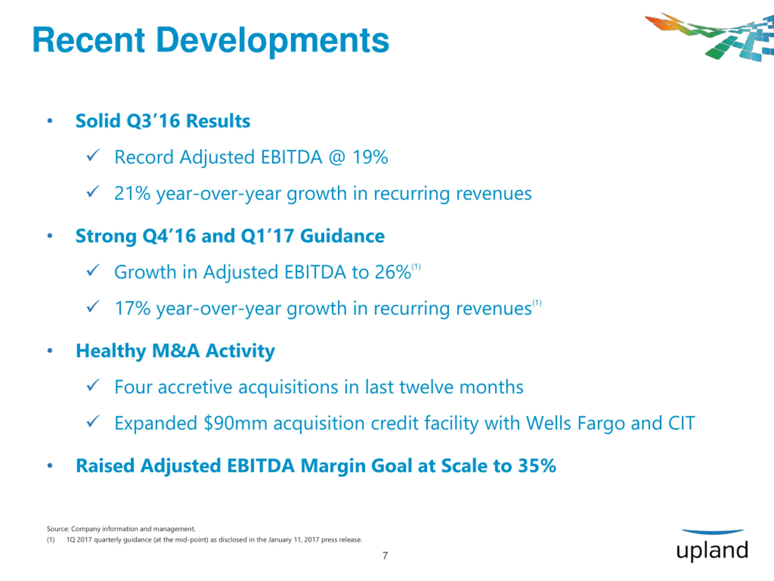 Run smoothly. Change quickly. Achieve more. Cloud-based enterprise work management software Upland Software, Inc. Needham Growth Conference January 2017 Jack McDonald Chairman & Chief Executive Officer, Upland Software