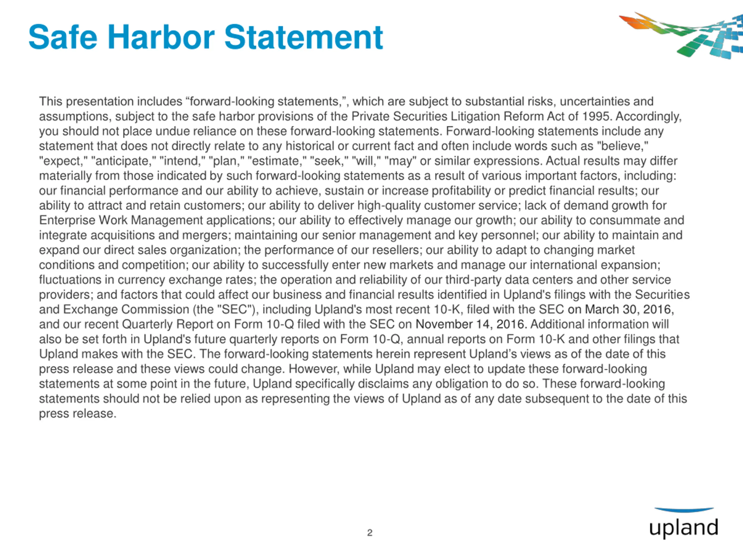 Safe Harbor Statement This presentation includes forward-looking statements, , which are subject to substantial risks, uncertainties and assumptions, subject to the safe harbor provisions of the Private Securities Litigation Reform Act of 1995. Accordingly, you should not place undue reliance on these forward-looking statements. Forward-looking statements include any statement that does not directly relate to any historical or current fact and often include words such as "believe," "expect," "anticipate," "intend," "plan," "estimate," "seek," "will," "may" or similar expressions. Actual results may differ materially from those indicated by such forward-looking statements as a result of various important factors, including: our financial performance and our ability to achieve, sustain or increase profitability or predict financial results; our ability to attract and retain customers; our ability to deliver high-quality customer service; lack of demand growth for Enterprise Work Management applications; our ability to effectively manage our growth; our ability to consummate and integrate acquisitions and mergers; maintaining our senior management and key personnel; our ability to maintain and expand our direct sales organization; the performance of our resellers; our ability to adapt to changing market conditions and competition; our ability to successfully enter new markets and manage our international expansion; fluctuations in currency exchange rates; the operation and reliability of our third-party data centers and other service providers; and factors that could affect our business and financial results identified in Upland's filings with the Securities and Exchange Commission (the "SEC"), including Upland's most recent 10-K, filed with the SEC on March 30, 2016, and our recent Quarterly Report on Form 10-Q filed with the SEC on November 14, 2016. Additional information will also be set forth in Upland's future quarterly reports on Form 10-Q, annual reports on Form 10-K and other filings that Upland makes with the SEC. The forward-looking statements herein represent Upland s views as of the date of this press release and these views could change. However, while Upland may elect to update these forward-looking statements at some point in the future, Upland specifically disclaims any obligation to do so. These forward-looking statements should not be relied upon as representing the views of Upland as of any date subsequent to the date of this press release. 2 2