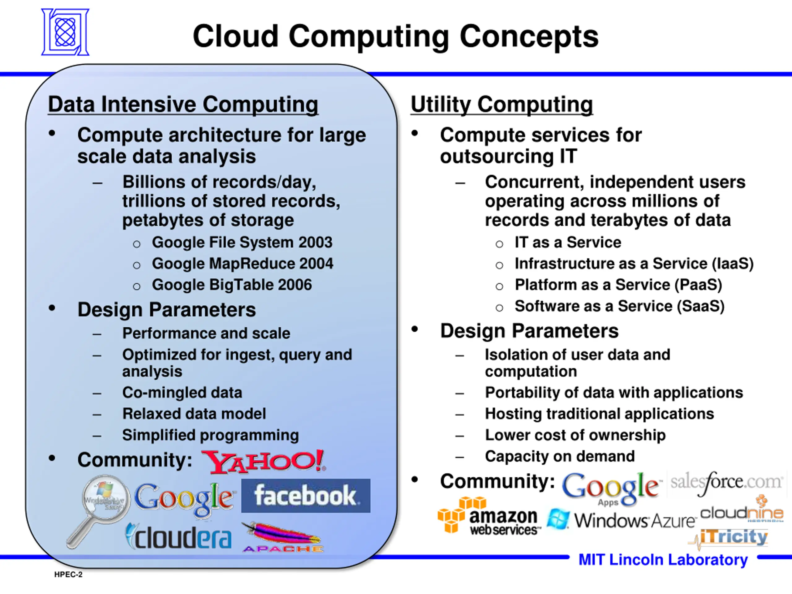 Cloud Computing Concepts Data Intensive Computing Compute architecture for large scale data analysis Billions of records/day, trillions of stored records, petabytes of storage o Google File System 2003 o Google MapReduce 2004 o Google BigTable 2006 Design Parameters Performance and scale Optimized for ingest, query and analysis Co-mingled data Relaxed data model Simplified programming Community: Utility Computing Compute services for outsourcing IT Concurrent, independent users operating across millions of records and terabytes of data o IT as a Service o Infrastructure as a Service (IaaS) o Platform as a Service (PaaS) o Software as a Service (SaaS) Design Parameters Isolation of user data and computation Portability of data with applications Hosting traditional applications Lower cost of ownership Capacity on demand Community: MIT Lincoln Laboratory HPEC-2