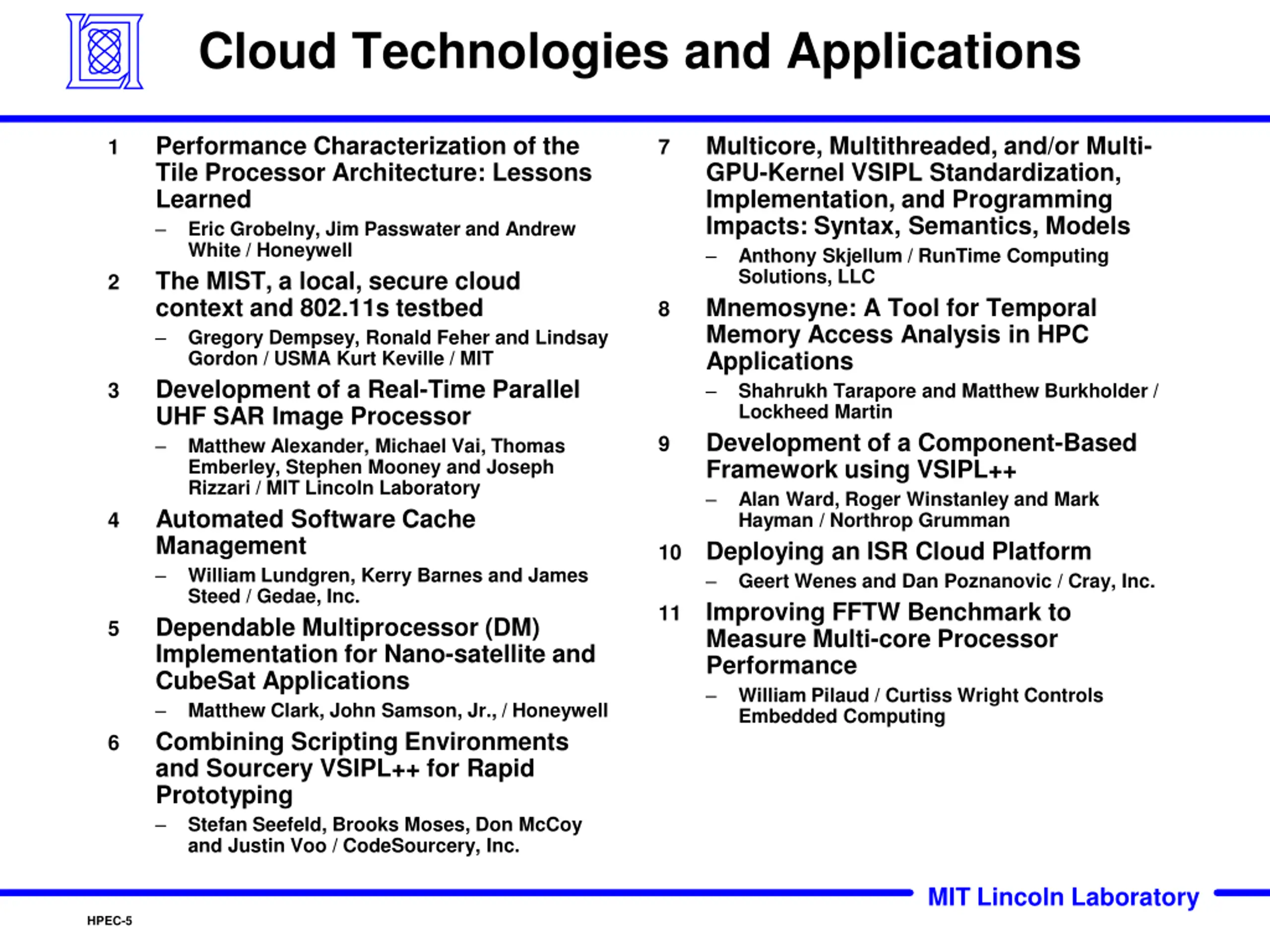 Cloud Technologies and Applications Performance Characterization of the Tile Processor Architecture: Lessons Learned Eric Grobelny, Jim Passwater and Andrew White / Honeywell The MIST, a local, secure cloud context and 802.11s testbed Gregory Dempsey, Ronald Feher and Lindsay Gordon / USMA Kurt Keville / MIT Development of a Real-Time Parallel UHF SAR Image Processor Matthew Alexander, Michael Vai, Thomas Emberley, Stephen Mooney and Joseph Rizzari / MIT Lincoln Laboratory Automated Software Cache Management William Lundgren, Kerry Barnes and James Steed / Gedae, Inc. Dependable Multiprocessor (DM) Implementation for Nano-satellite and CubeSat Applications Matthew Clark, John Samson, Jr., / Honeywell Combining Scripting Environments and Sourcery VSIPL++ for Rapid Prototyping Stefan Seefeld, Brooks Moses, Don McCoy and Justin Voo / CodeSourcery, Inc. Multicore, Multithreaded, and/or Multi- GPU-Kernel VSIPL Standardization, Implementation, and Programming Impacts: Syntax, Semantics, Models Anthony Skjellum / RunTime Computing Solutions, LLC Mnemosyne: A Tool for Temporal Memory Access Analysis in HPC Applications Shahrukh Tarapore and Matthew Burkholder / Lockheed Martin Development of a Component-Based Framework using VSIPL++ Alan Ward, Roger Winstanley and Mark Hayman / Northrop Grumman Deploying an ISR Cloud Platform Geert Wenes and Dan Poznanovic / Cray, Inc. Improving FFTW Benchmark to Measure Multi-core Processor Performance William Pilaud / Curtiss Wright Controls Embedded Computing 1 7 2 8 3 9 4 10 11 5 6 MIT Lincoln Laboratory HPEC-5