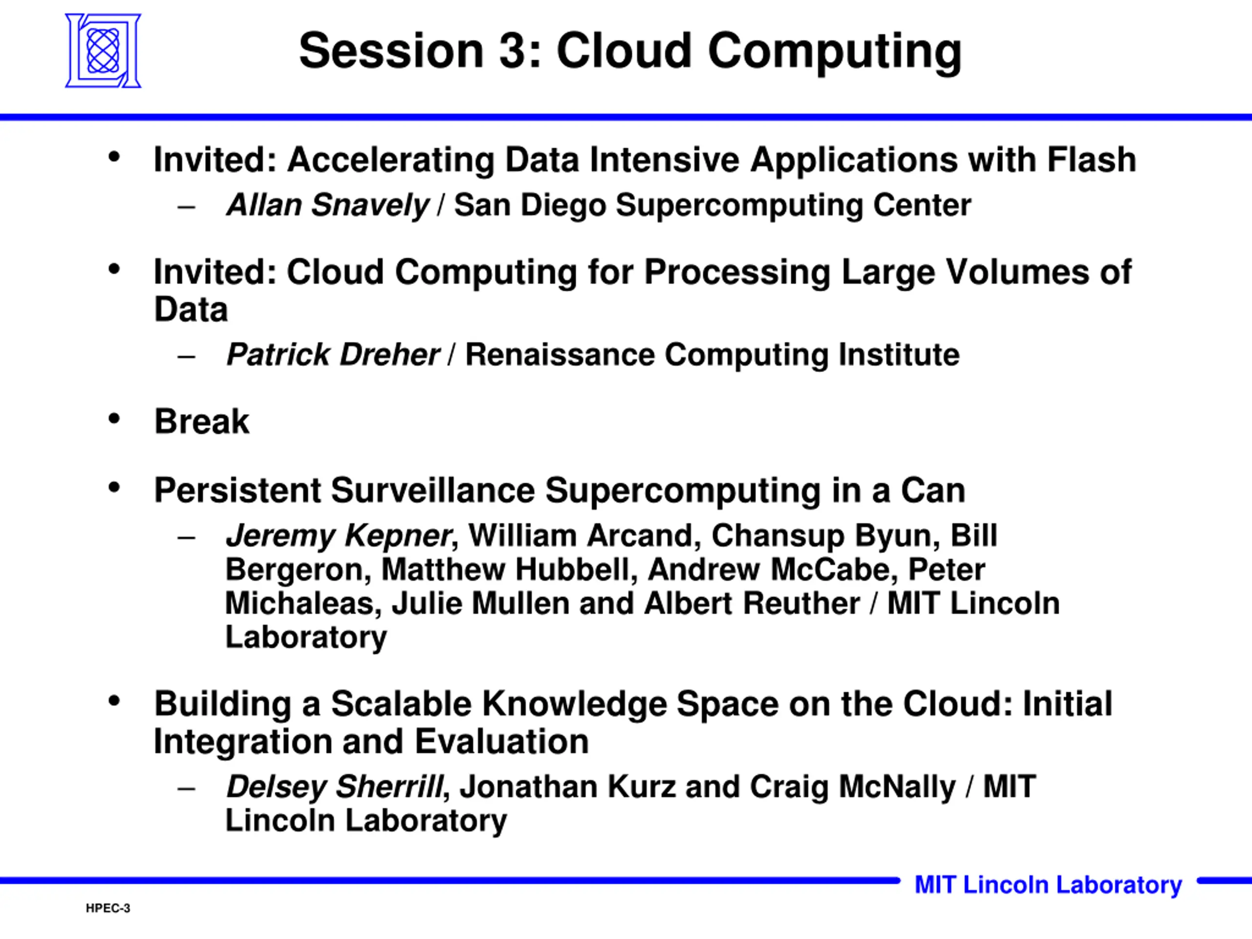 Session 3: Cloud Computing Invited: Accelerating Data Intensive Applications with Flash Allan Snavely / San Diego Supercomputing Center Invited: Cloud Computing for Processing Large Volumes of Data Patrick Dreher / Renaissance Computing Institute Break Persistent Surveillance Supercomputing in a Can Jeremy Kepner, William Arcand, Chansup Byun, Bill Bergeron, Matthew Hubbell, Andrew McCabe, Peter Michaleas, Julie Mullen and Albert Reuther / MIT Lincoln Laboratory Building a Scalable Knowledge Space on the Cloud: Initial Integration and Evaluation Delsey Sherrill, Jonathan Kurz and Craig McNally / MIT Lincoln Laboratory MIT Lincoln Laboratory HPEC-3