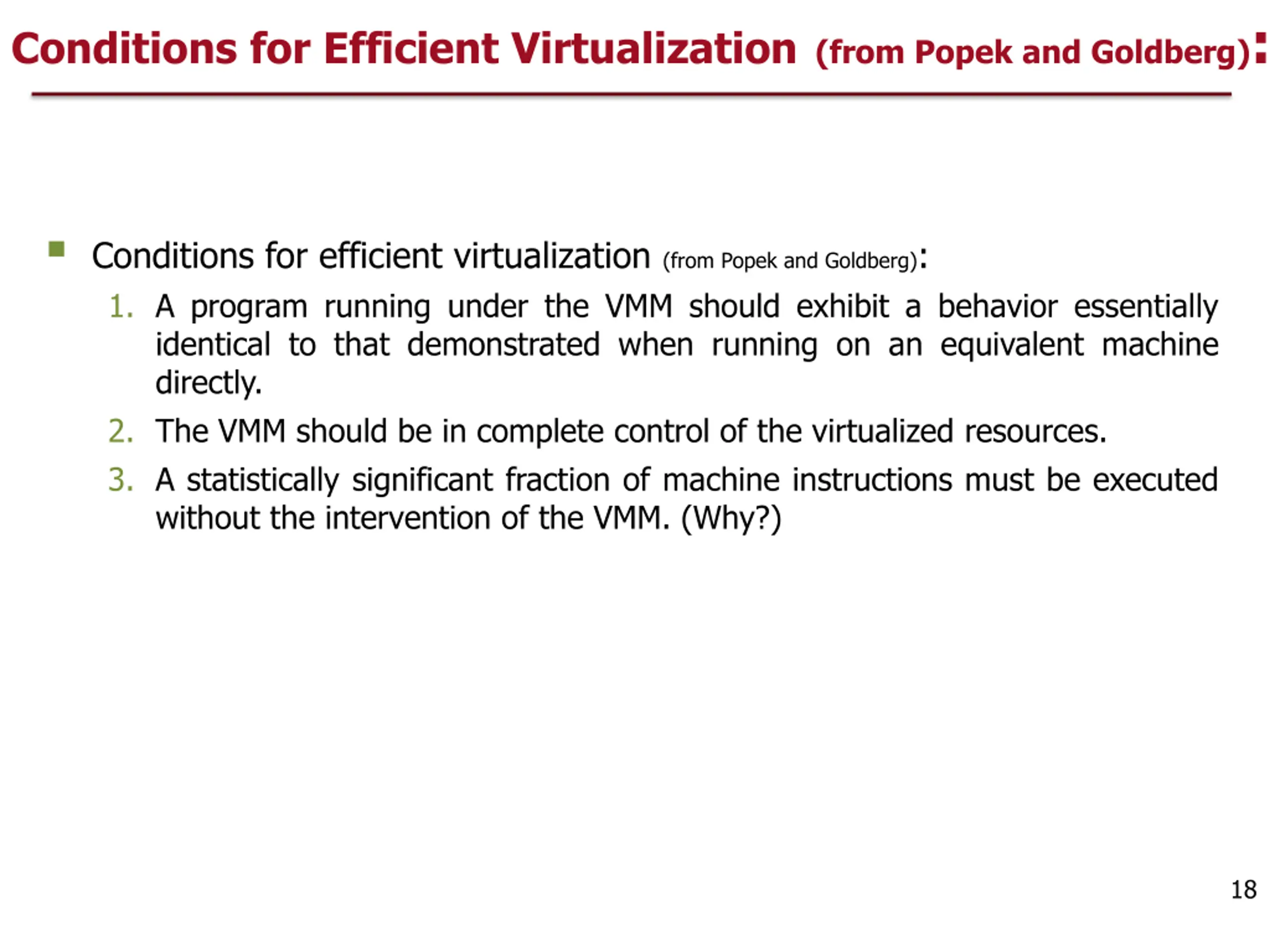 Conditions for Efficient Virtualization(from Popek and Goldberg): Conditions for efficient virtualization (from Popek and Goldberg): 1. A program running under the VMM should exhibit a behavior essentially identical to that demonstrated when running on an equivalent machine directly. 2. The VMM should be in complete control of the virtualized resources. 3. A statistically significant fraction of machine instructions must be executed without the intervention of the VMM. (Why?) 18