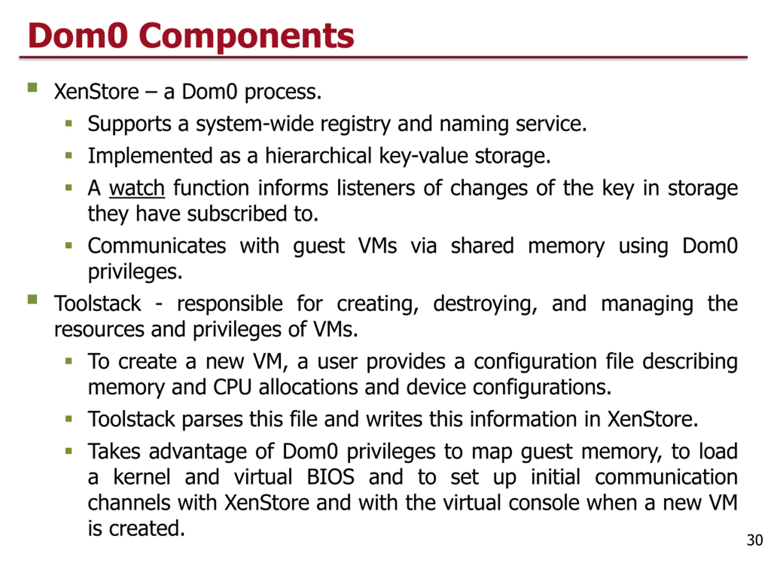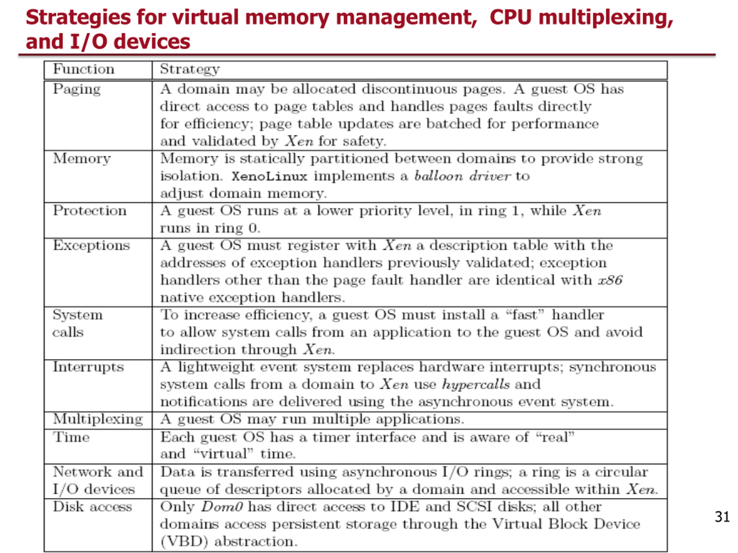 Dom0 Components XenStore a Dom0 process. Supports a system-wide registry and naming service. Implemented as a hierarchical key-value storage. A watch function informs listeners of changes of the key in storage they have subscribed to. Communicates with guest VMs via shared memory using Dom0 privileges. Toolstack - responsible for creating, destroying, and managing the resources and privileges of VMs. To create a new VM, a user provides a configuration file describing memory and CPU allocations and device configurations. Toolstack parses this file and writes this information in XenStore. Takes advantage of Dom0 privileges to map guest memory, to load a kernel and virtual BIOS and to set up initial communication channels with XenStore and with the virtual console when a new VM is created. 30
