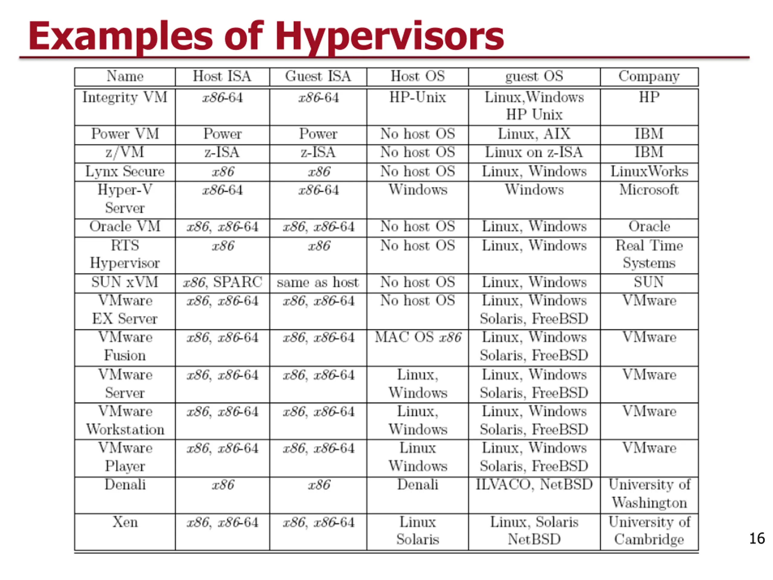 Type 1 and 2 Hypervisors Type 1 Hypervisor Type 2 Hypervisor Taxonomy of VMMs: 1. Type 1 Hypervisor (bare metal, native): supports multiple virtual machines and runs directly on the hardware (e.g., VMware ESX , Xen, Denali) 2. Type 2 Hypervisor (hosted) VM - runs under a host operating system (e.g., user-mode Linux) 15