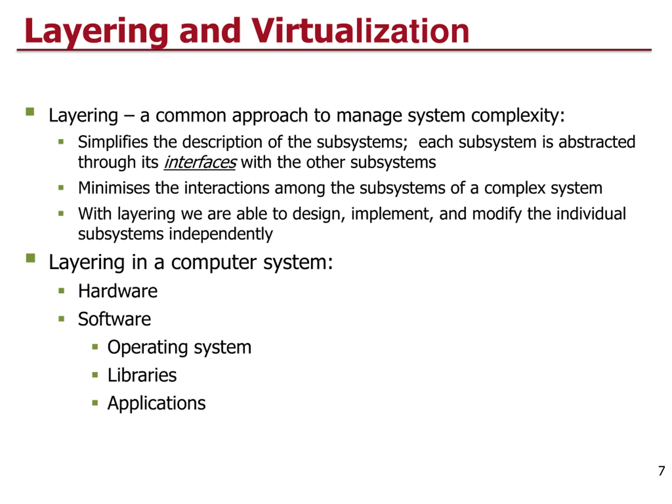 Layering and Virtualization Layering a common approach to manage system complexity: Simplifies the description of the subsystems; each subsystem is abstracted through its interfaces with the other subsystems Minimises the interactions among the subsystems of a complex system With layering we are able to design, implement, and modify the individual subsystems independently Layering in a computer system: Hardware Software Operating system Libraries Applications 7