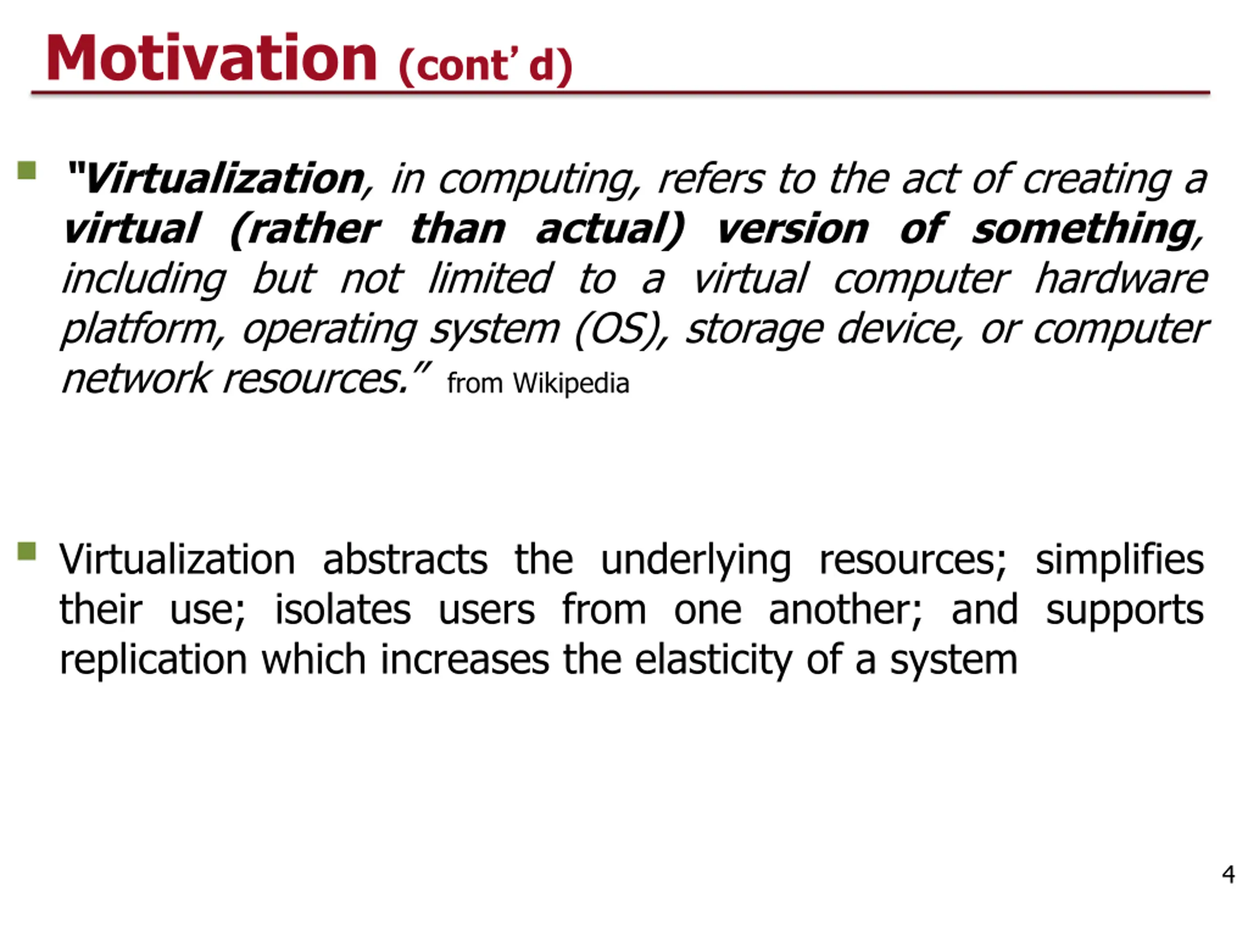 Motivation Three fundamental abstractions are necessary to describe the operation of a computing systems: (1) interpreters/processors, (2) memory, (3) communications links As the scale of a system and the size of its users grows, it becomes very challenging to manage its recourses (see three points above) Resource management issues: provision for peak demands overprovisioning heterogeneity of hardware and software machine failures Virtualization is a basic enabler of Cloud Computing, it simplifies the management of physical resources for the three abstractions For example, the state of a virtual machine (VM) running under a virtual machine monitor (VMM) can de saved and migrated to another server to balance the load For example, virtualization allows users to operate in environments they are familiar with, rather than forcing them to specific ones 3