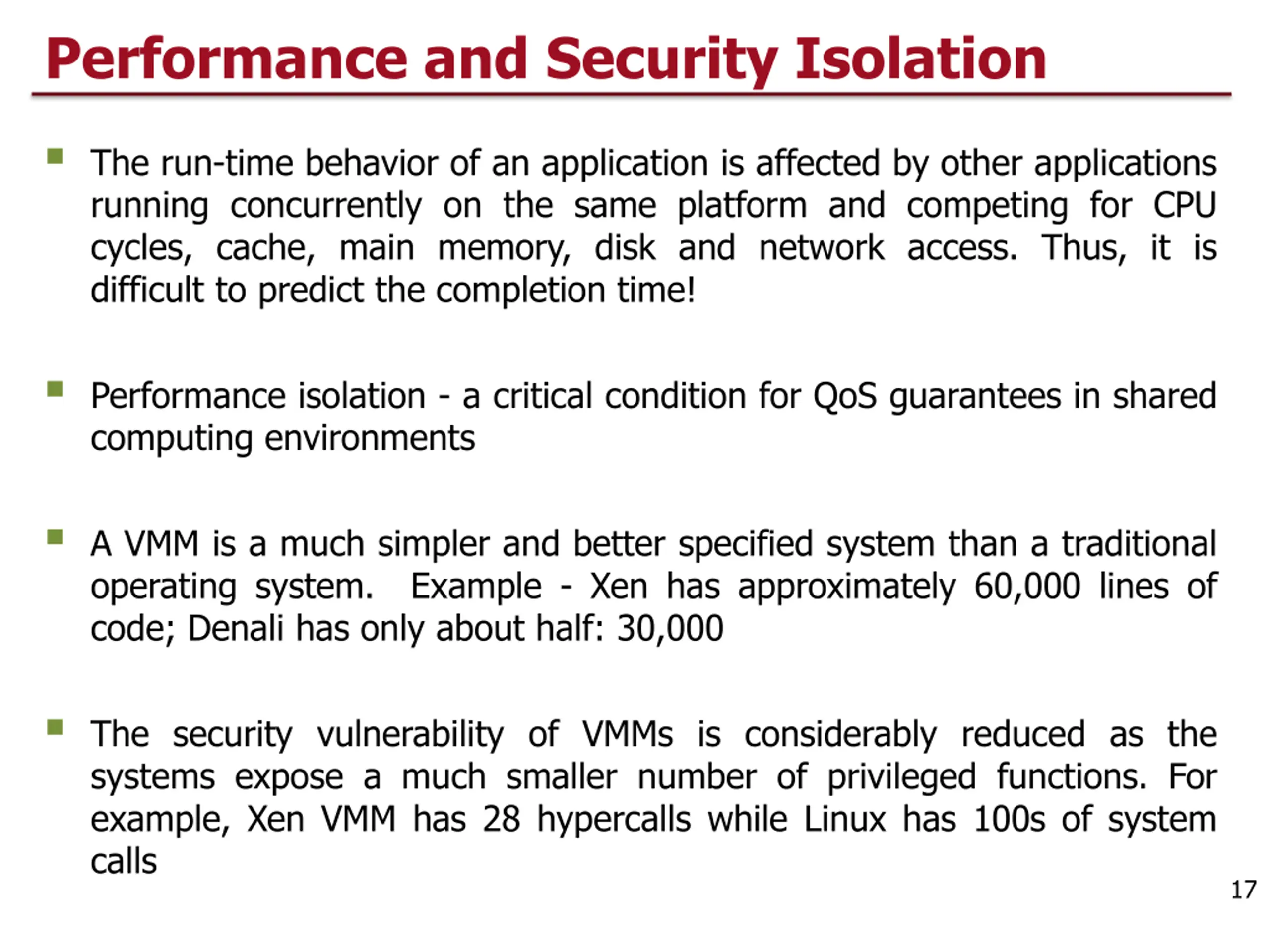 Performance and Security Isolation The run-time behavior of an application is affected by other applications running concurrently on the same platform and competing for CPU cycles, cache, main memory, disk and network access. Thus, it is difficult to predict the completion time! Performance isolation - a critical condition for QoS guarantees in shared computing environments A VMM is a much simpler and better specified system than a traditional operating system. Example - Xen has approximately 60,000 lines of code; Denali has only about half: 30,000 The security vulnerability of VMMs is considerably reduced as the systems expose a much smaller number of privileged functions. For example, Xen VMM has 28 hypercalls while Linux has 100s of system calls 17