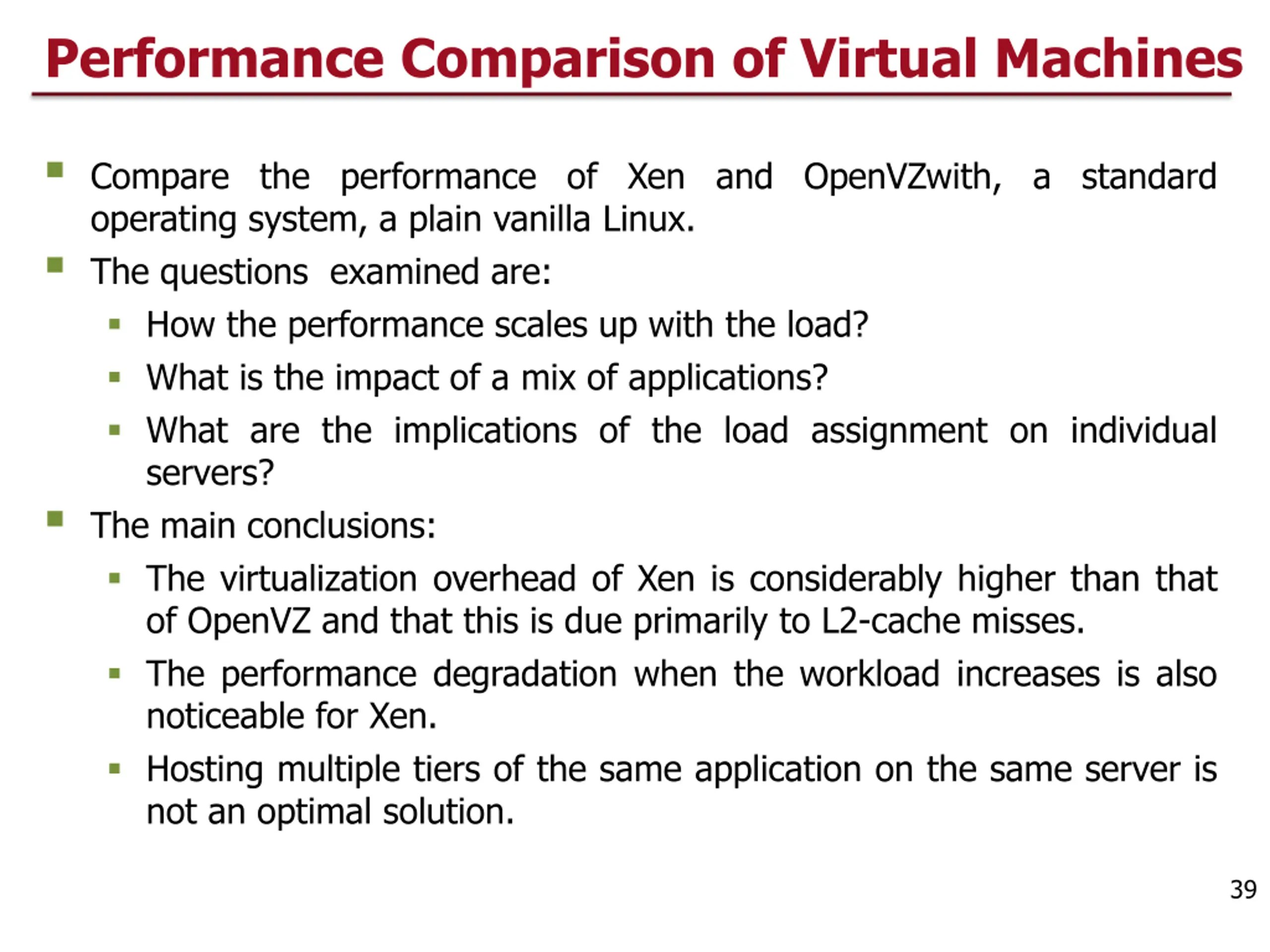 Performance Comparison of Virtual Machines Compare the performance of Xen and OpenVZwith, a standard operating system, a plain vanilla Linux. The questions examined are: How the performance scales up with the load? What is the impact of a mix of applications? What are the implications of the load assignment on individual servers? The main conclusions: The virtualization overhead of Xen is considerably higher than that of OpenVZ and that this is due primarily to L2-cache misses. The performance degradation when the workload increases is also noticeable for Xen. Hosting multiple tiers of the same application on the same server is not an optimal solution. 39