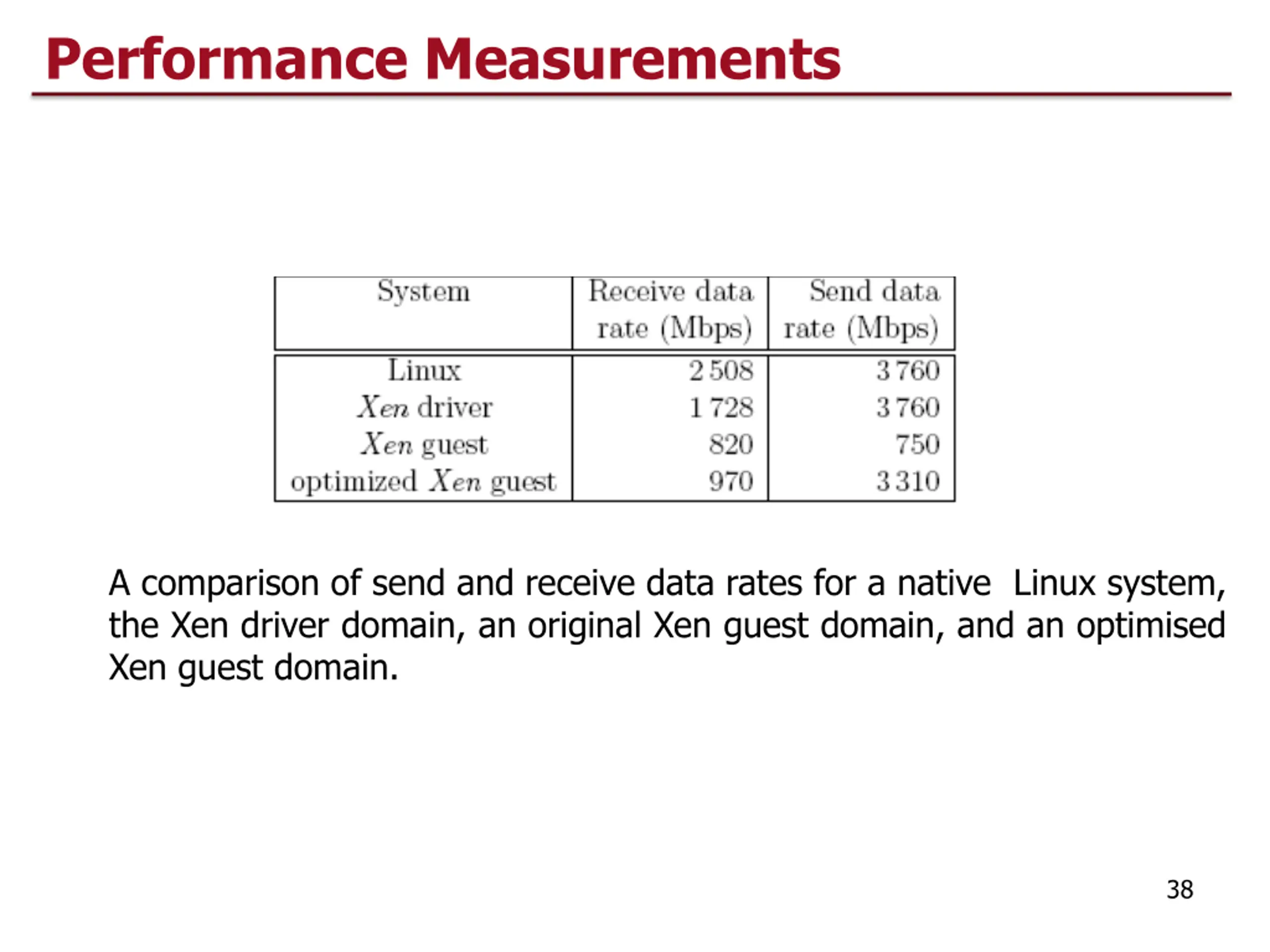 Performance Measurements A comparison of send and receive data rates for a native Linux system, the Xen driver domain, an original Xen guest domain, and an optimised Xen guest domain. 38