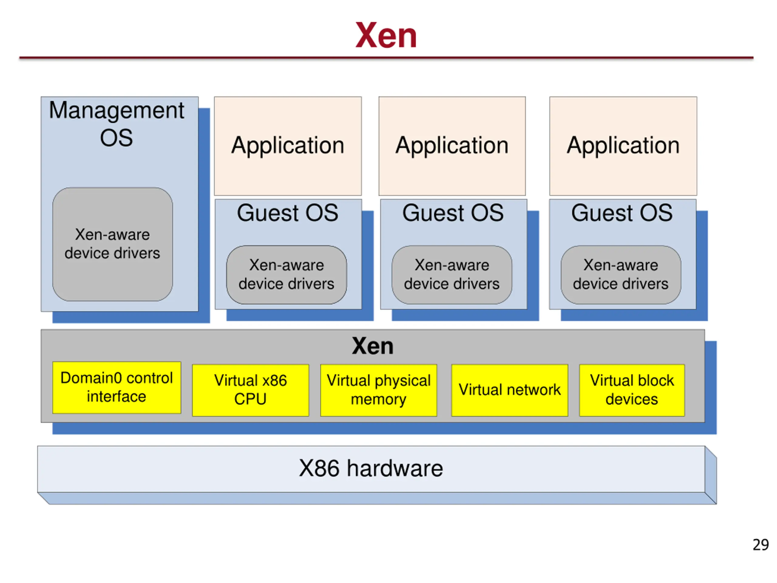 Xen Management OS Application Application Application Guest OS Guest OS Guest OS Xen-aware device drivers Xen-aware device drivers device drivers Xen-aware Xen-aware device drivers Xen-aware device drivers Xen Domain0 control interface Virtual x86 CPU Virtual physical memory Virtual block devices Virtual network X86 hardware 29