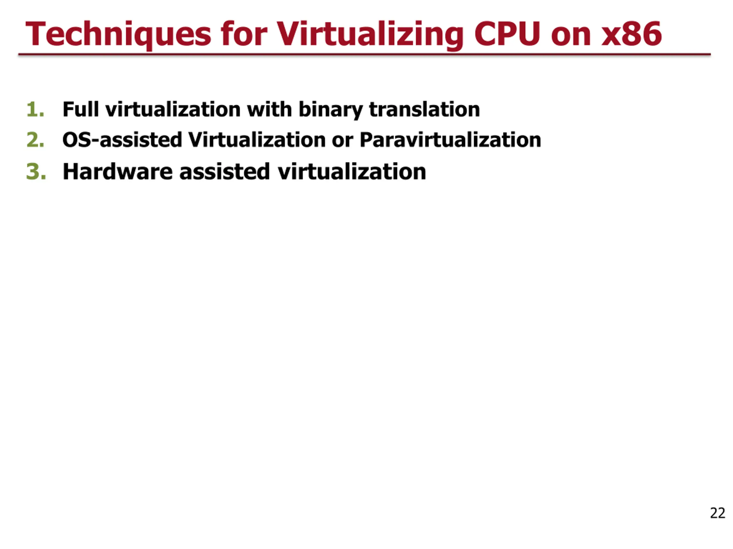 Techniques for Virtualizing CPU on x86 1. Full virtualization with binary translation 2. OS-assisted Virtualization or Paravirtualization 3. Hardware assisted virtualization 22