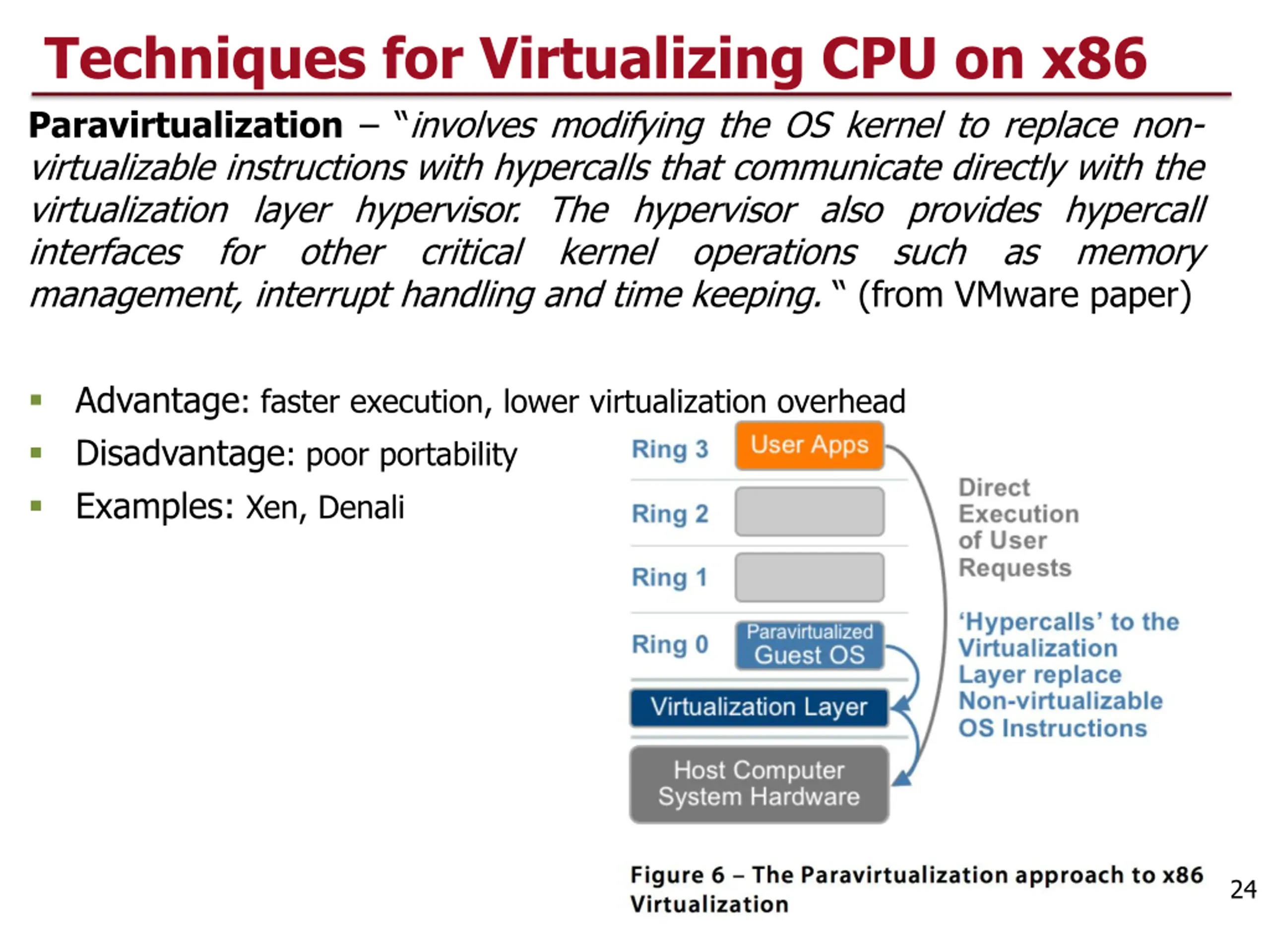 Techniques for Virtualizing CPU on x86 Full virtualization a guest OS can run unchanged under the VMM as if it was running directly on the hardware platform. Each VM runs an exact copy of the actual hardware. Binary translation rewrites parts of the code on the fly to replace sensitive but not privileged instructions with safe code to emulate the original instruction The hypervisor translates all operating system instructions on the fly and caches the results for future use, while user level instructions run unmodified at native speed. (from VMware paper) Examples: VMware, Microsoft Virtual Server Advantages: No hardware assistance, No modifications of the guest OS Isolation, Security Disadvantages: Speed of execution 23
