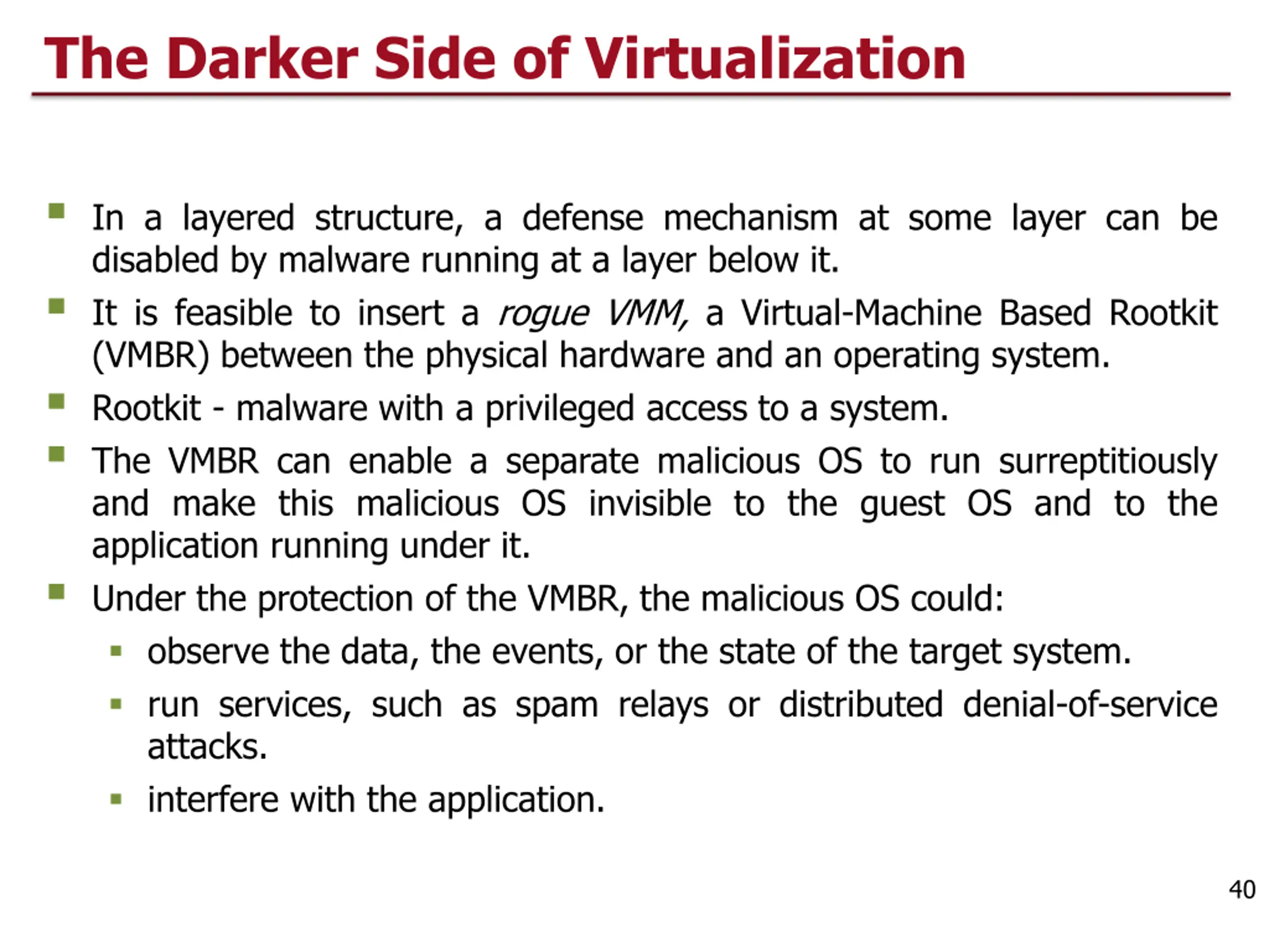 The Darker Side of Virtualization In a layered structure, a defense mechanism at some layer can be disabled by malware running at a layer below it. It is feasible to insert a rogue VMM, a Virtual-Machine Based Rootkit (VMBR) between the physical hardware and an operating system. Rootkit - malware with a privileged access to a system. The VMBR can enable a separate malicious OS to run surreptitiously and make this malicious OS invisible to the guest OS and to the application running under it. Under the protection of the VMBR, the malicious OS could: observe the data, the events, or the state of the target system. run services, such as spam relays or distributed denial-of-service attacks. interfere with the application. 40