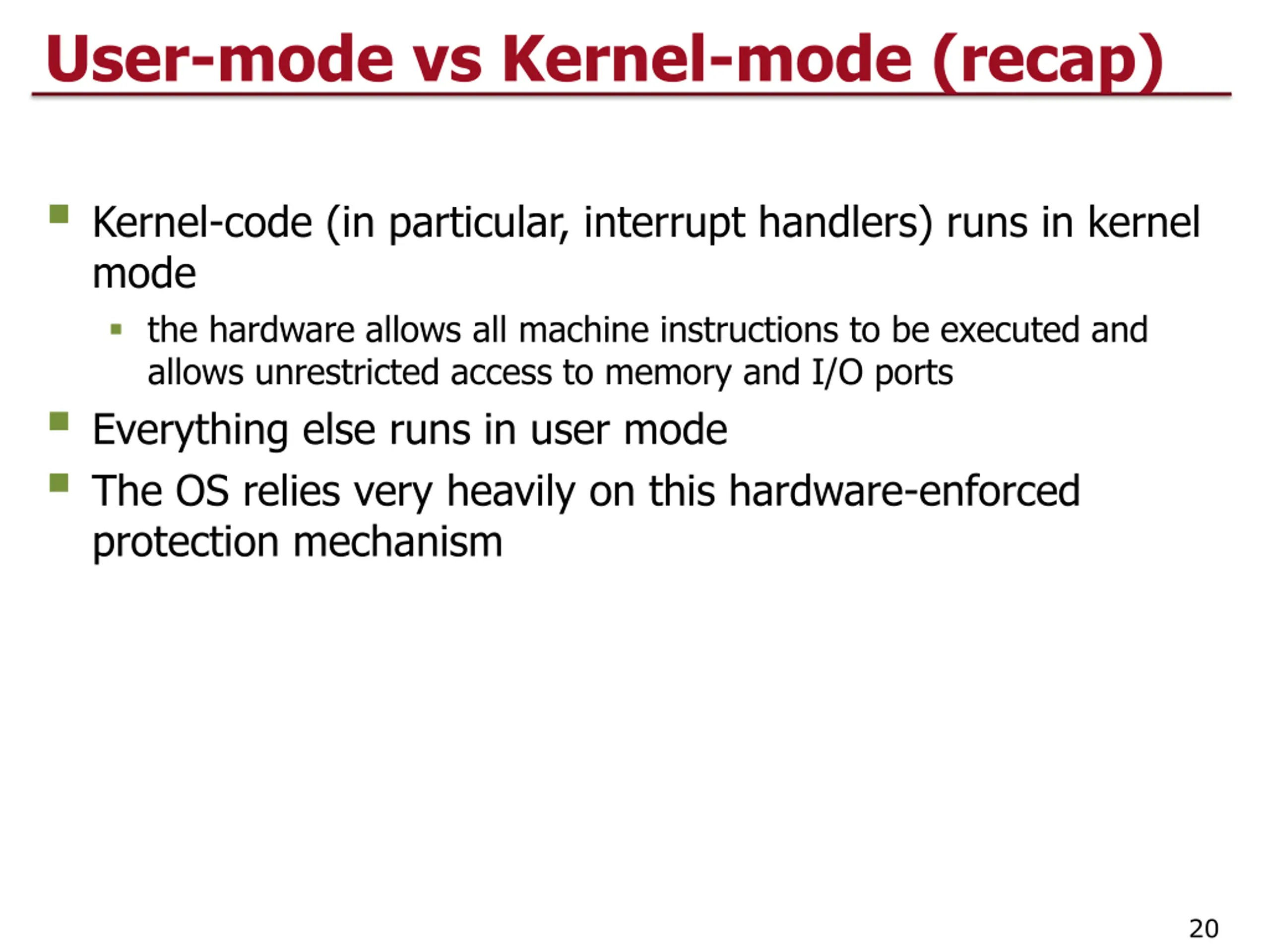 User-mode vs Kernel-mode (recap) Kernel-code (in particular, interrupt handlers) runs in kernel mode the hardware allows all machine instructions to be executed and allows unrestricted access to memory and I/O ports Everything else runs in user mode The OS relies very heavily on this hardware-enforced protection mechanism 20