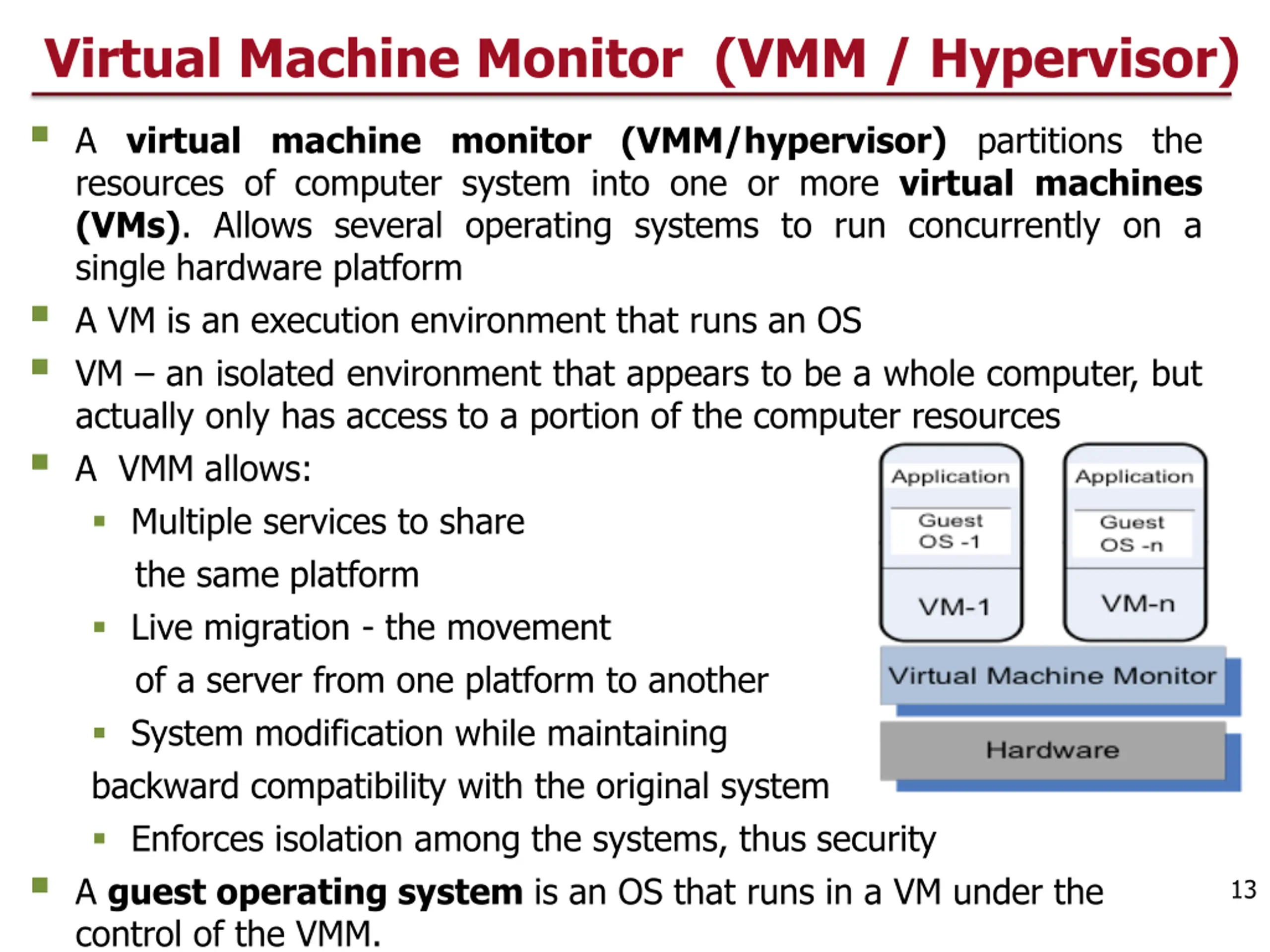 Virtual Machine Monitor (VMM / Hypervisor) A virtual machine monitor (VMM/hypervisor) partitions the resources of computer system into one or more virtual machines (VMs). Allows several operating systems to run concurrently on a single hardware platform A VM is an execution environment that runs an OS VM an isolated environment that appears to be a whole computer, but actually only has access to a portion of the computer resources A VMM allows: Multiple services to share the same platform Live migration - the movement of a server from one platform to another System modification while maintaining backward compatibility with the original system Enforces isolation among the systems, thus security A guest operating system is an OS that runs in a VM under the control of the VMM. 13