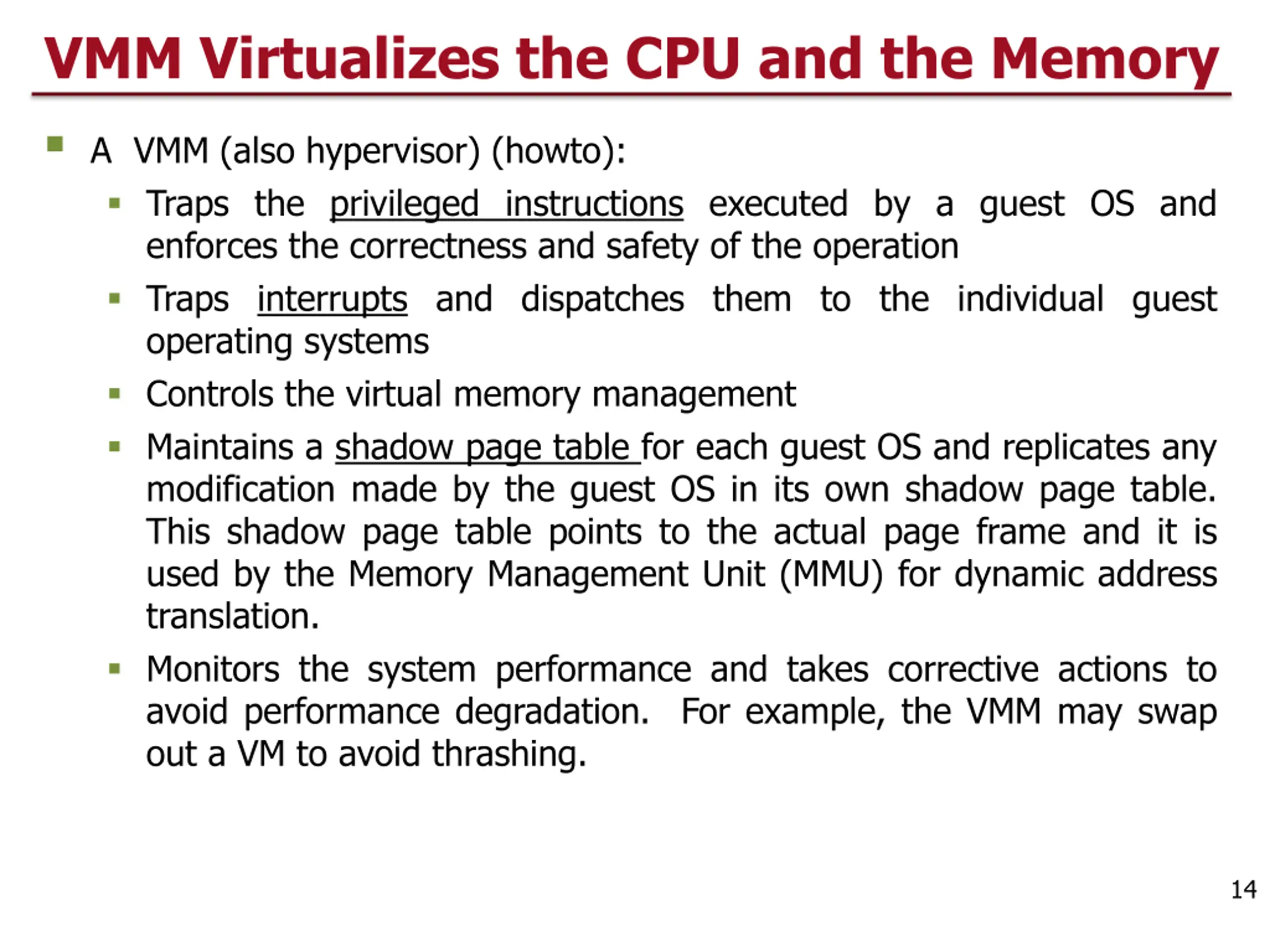 VMM Virtualizes the CPU and the Memory A VMM (also hypervisor) (howto): Traps the privileged instructions executed by a guest OS and enforces the correctness and safety of the operation Traps interrupts and dispatches them to the individual guest operating systems Controls the virtual memory management Maintains a shadow page table for each guest OS and replicates any modification made by the guest OS in its own shadow page table. This shadow page table points to the actual page frame and it is used by the Memory Management Unit (MMU) for dynamic address translation. Monitors the system performance and takes corrective actions to avoid performance degradation. For example, the VMM may swap out a VM to avoid thrashing. 14
