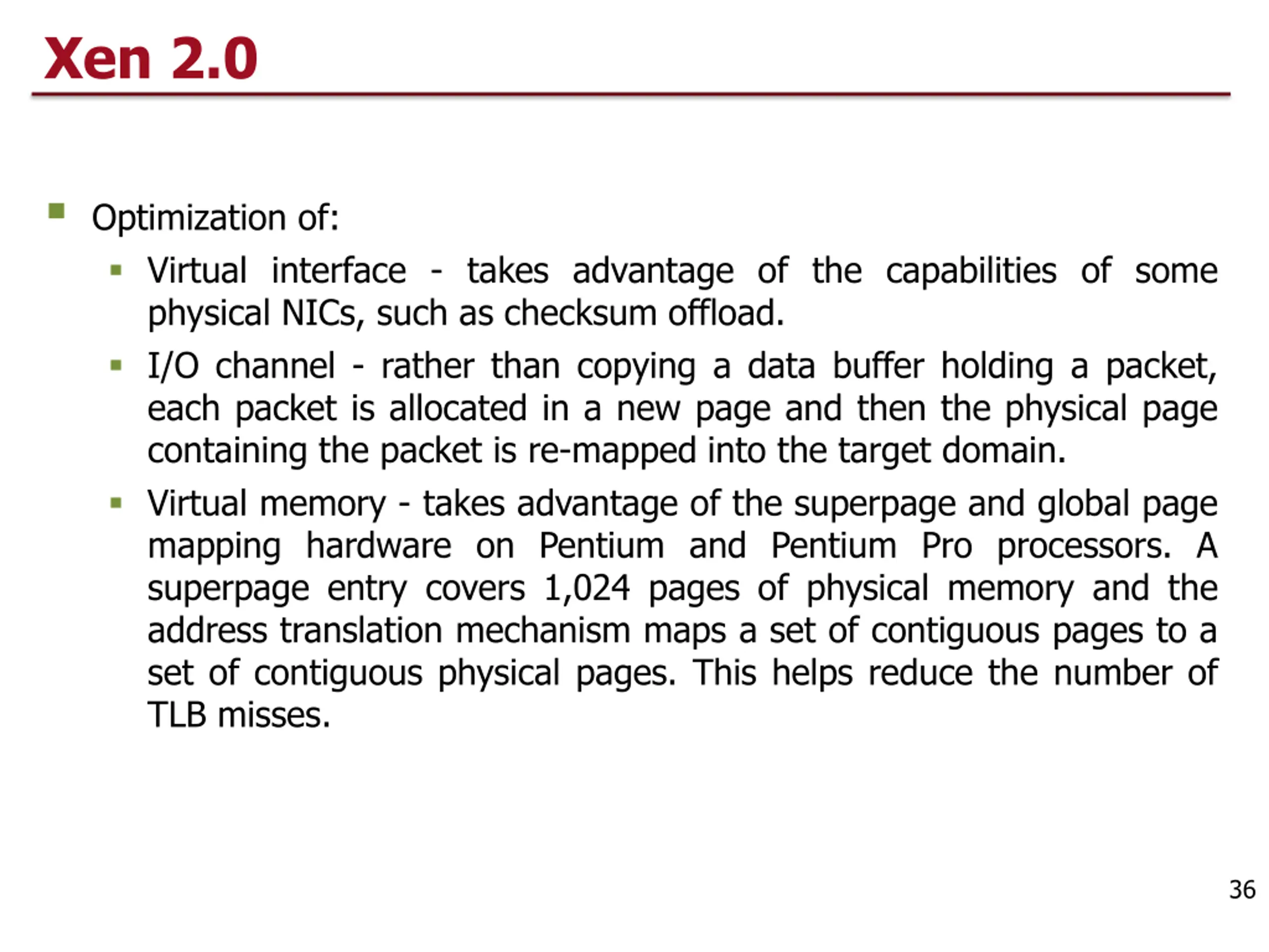 Xen 2.0 Optimization of: Virtual interface - takes advantage of the capabilities of some physical NICs, such as checksum offload. I/O channel - rather than copying a data buffer holding a packet, each packet is allocated in a new page and then the physical page containing the packet is re-mapped into the target domain. Virtual memory - takes advantage of the superpage and global page mapping hardware on Pentium and Pentium Pro processors. A superpage entry covers 1,024 pages of physical memory and the address translation mechanism maps a set of contiguous pages to a set of contiguous physical pages. This helps reduce the number of TLB misses. 36
