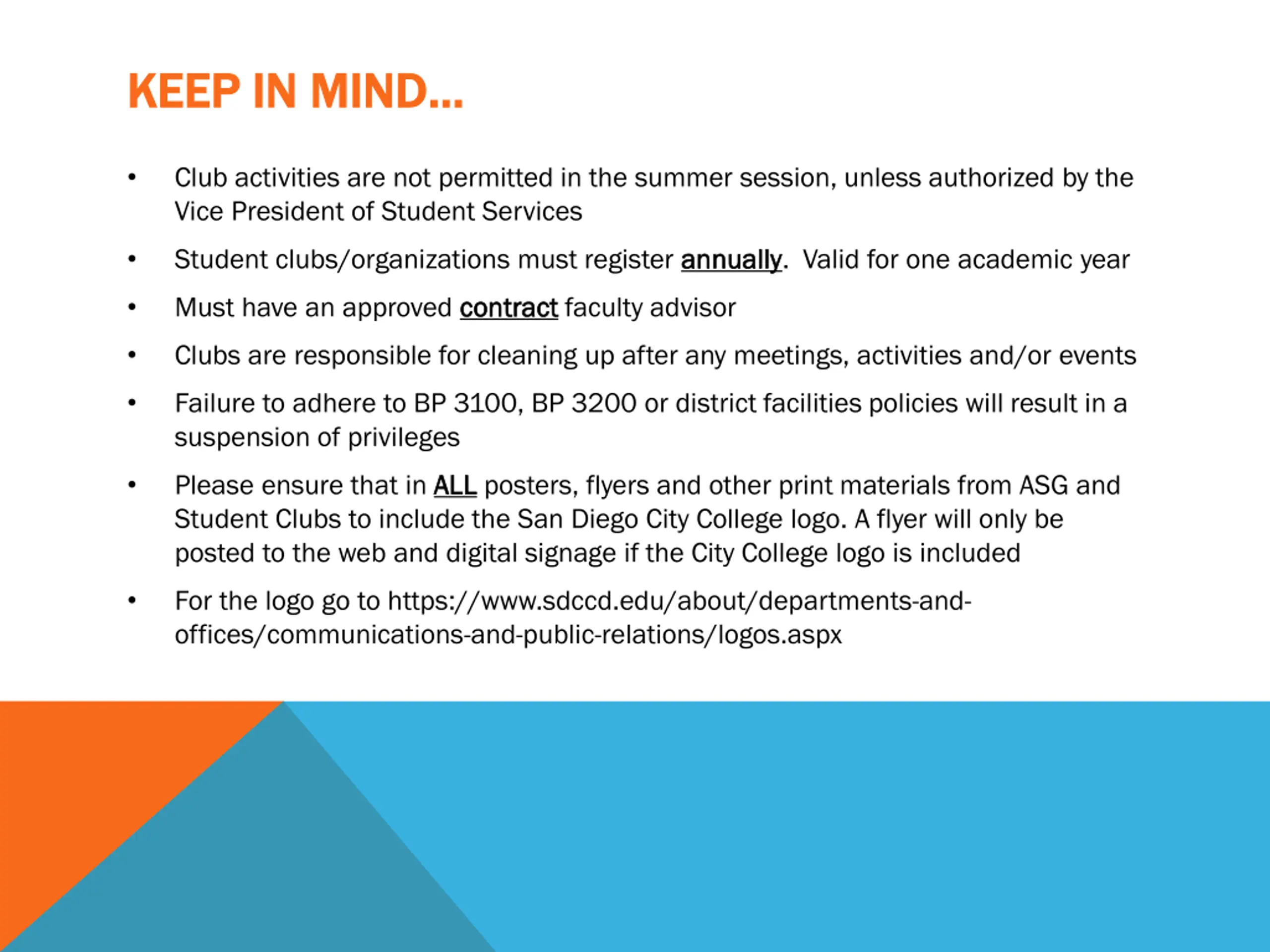 KEEP IN MIND KEEP IN MIND Club activities are not permitted in the summer session, unless authorized by the Vice President of Student Services Student clubs/organizations must register annually annually. Valid for one academic year Must have an approved contract contract faculty advisor Clubs are responsible for cleaning up after any meetings, activities and/or events Failure to adhere to BP 3100, BP 3200 or district facilities policies will result in a suspension of privileges Please ensure that in ALL Student Clubs to include the San Diego City College logo. A flyer will only be posted to the web and digital signage if the City College logo is included ALL posters, flyers and other print materials from ASG and For the logo go to https://www.sdccd.edu/about/departments-and- offices/communications-and-public-relations/logos.aspx